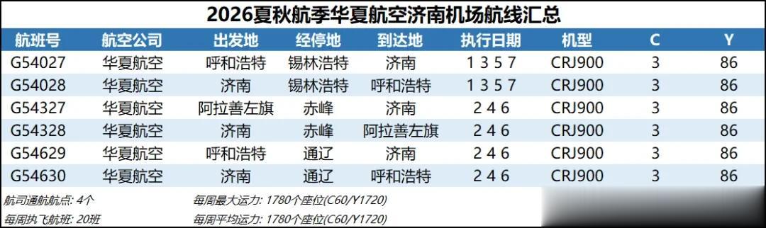 26 华夏航空 华夏航空原呼和浩特-赤峰-济南航线改为经停通辽,算是填补了天航停飞济南-通辽的空白,另外华夏航空新开了阿拉善左旗巴彦浩特-呼和浩特-济南航线,阿拉善左旗也是济南机场历史通航过的最小的机场。