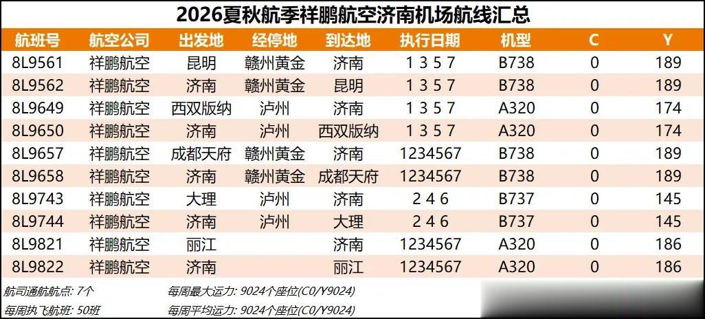12 祥鹏航空 新航季祥鹏航空在济南机场的航线变化非常抽象,ta停了济南-成都天府和济南-昆明的直飞,开了济南-泸州-大理,恢复了济南-丽江和济南-赣州黄金-昆明,属于是停干线开支线,这种操作还是比较罕见的。本航季祥鹏在济南的通航城市达到了7座,创下新高,而班次最高的航点竟然是赣州黄金【每周11班】,个人认为每周一三五日的济南-赣州-天府改成经停赣州瑞金还合理一些。