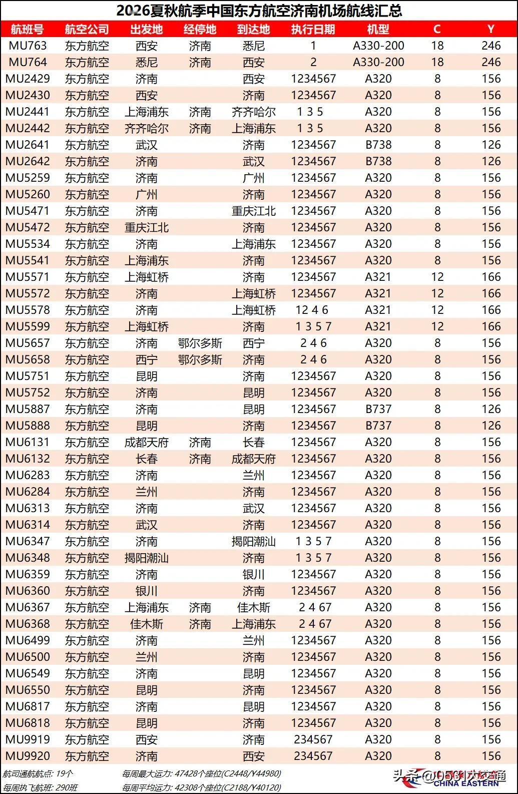 02 东方航空 夏秋航季东方航空在济南的航线变化也不多:济南-昆明加密到了每日4班,济南-兰州加密到了每日2班;目前看来济南-鄂尔多斯-西宁航线运营状况非常糟糕,春运期间该航线基本处于停飞状态,本航季每周一三五日也停飞改成了济南-揭阳潮汕,5-6月份更是全部取消。新航季东航在济南机场的早出港过夜飞机仅剩5-6架,但运力同比持平。