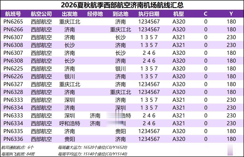 08 西部航空 西部航空本航季在济南没有新增新的航点,但排班有所调整,大概的交路是一架深圳基地的A321飞深圳-济南-呼和浩特/长沙-济南-深圳,一架重庆基地的A320飞重庆-济南-银川/长沙-济南-贵阳-济南-重庆,大概也是发现济南-呼和浩特间的运力短缺后临时做了调整。