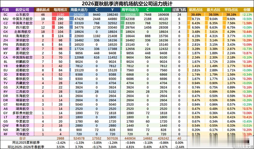 首先还是来看2026夏秋航季济南机场各航司运力占比统计,新航季济南机场共29家航司开通定期正班航线【不含泰狮航、越捷等旅游包机】,其中龙江航空为首次进入济南市场,运力前5位的航司仍为山航、东航、南航、川航和北部湾。