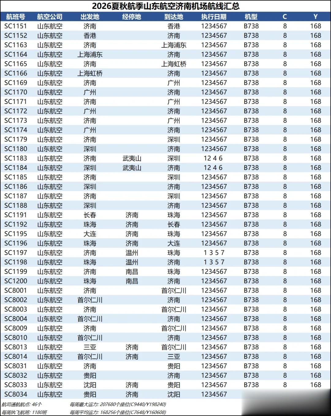 新航季山航济南出港航线中国内航线变化不大,恢复了济南-绵阳-丽江航线,停飞了运城、台州的经停航线,此外济南-成都天府航线调整了一个晚班到成都双流;国际地区航线方面,也算顺应形势,济南-大阪关西、济南-香港减到每日1班,济南-首尔仁川加密到每日4班,也是创下了山航济南-仁川航线的新高,济南-曼谷素万纳普加密到每周5班,今年新开的三条东南亚航线夏秋航季延续飞行,吉隆坡维持每日1班,胡志明加密到每日1班,河内减至每周3班。本航季山航在济南机场的日均出港国际港澳台航班超过10班,目前山航在济南的白菜价国际中转也是济南机场国际客流的基本盘。