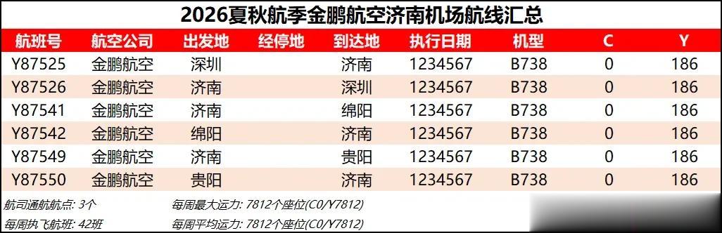 13 金鹏航空 金鹏航空还是老玩法,开行深圳-济南-贵阳-济南-绵阳-济南-深圳航线。