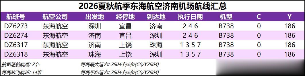 20 东海航空 东海航空新航季开通了济南-上饶-珠海航线,并继续开行济南-宜昌-深圳航线。