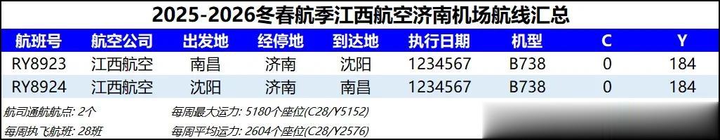 19 江西航空 江西航空本航季仅开行每日1班沈阳-济南-南昌航线。