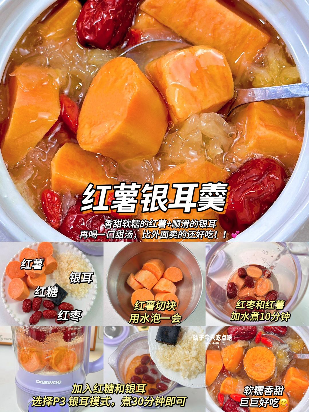 做法:红薯+红枣加水煮10分钟,加入银耳和红糖。选择银耳模式煮30分钟。