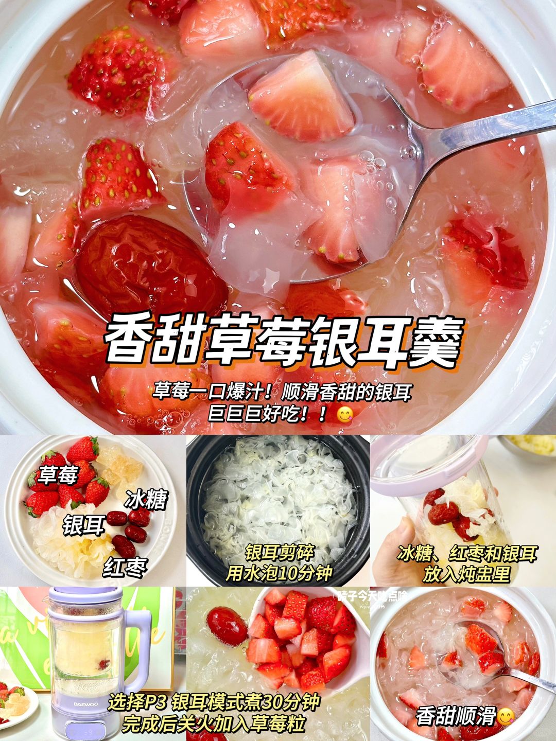 做法:银耳剪碎泡10分钟,方便出胶质。冰糖、红枣和银耳放进炖盅,选择银耳模式煮30分钟,完成后加入草莓粒搅拌即可。