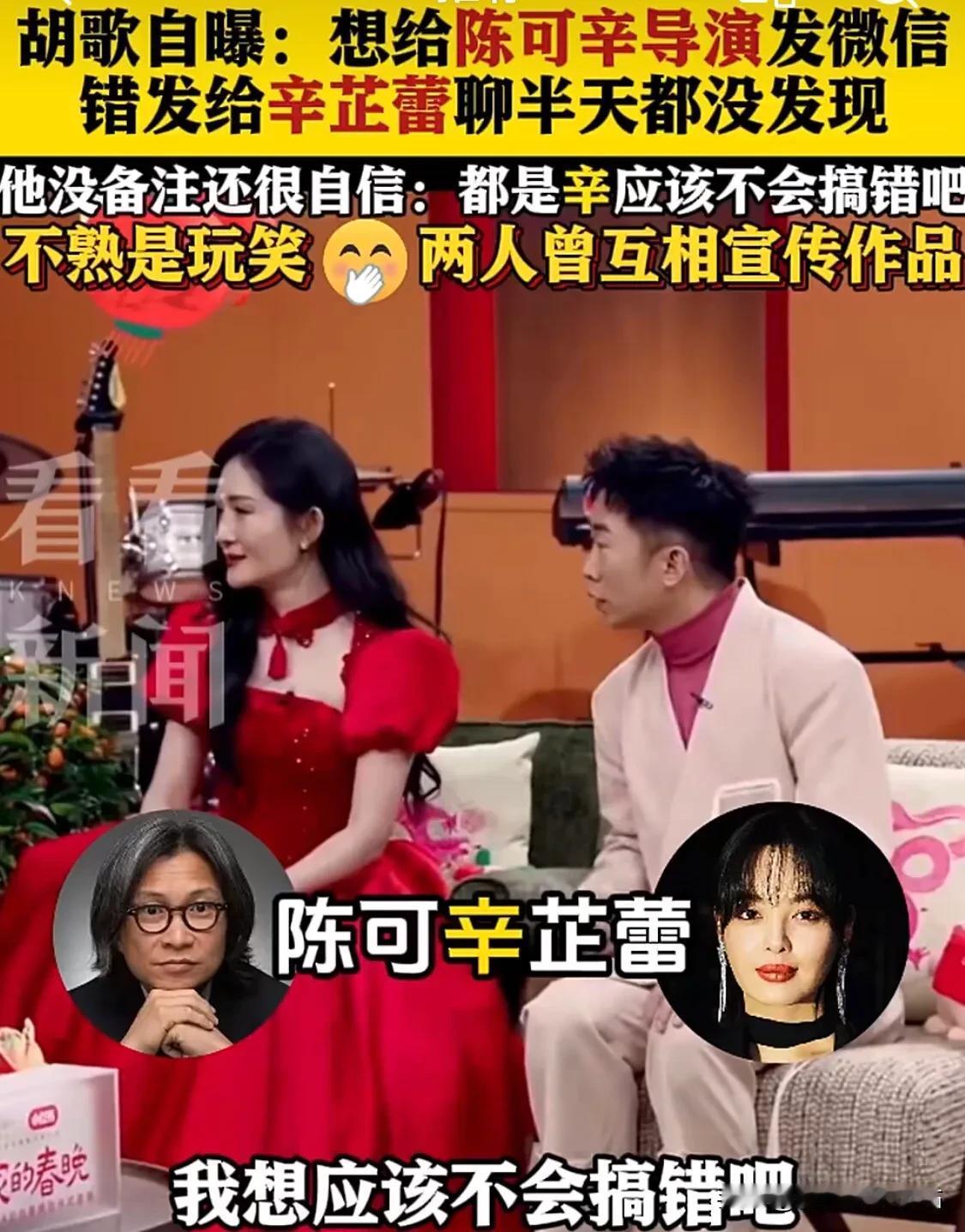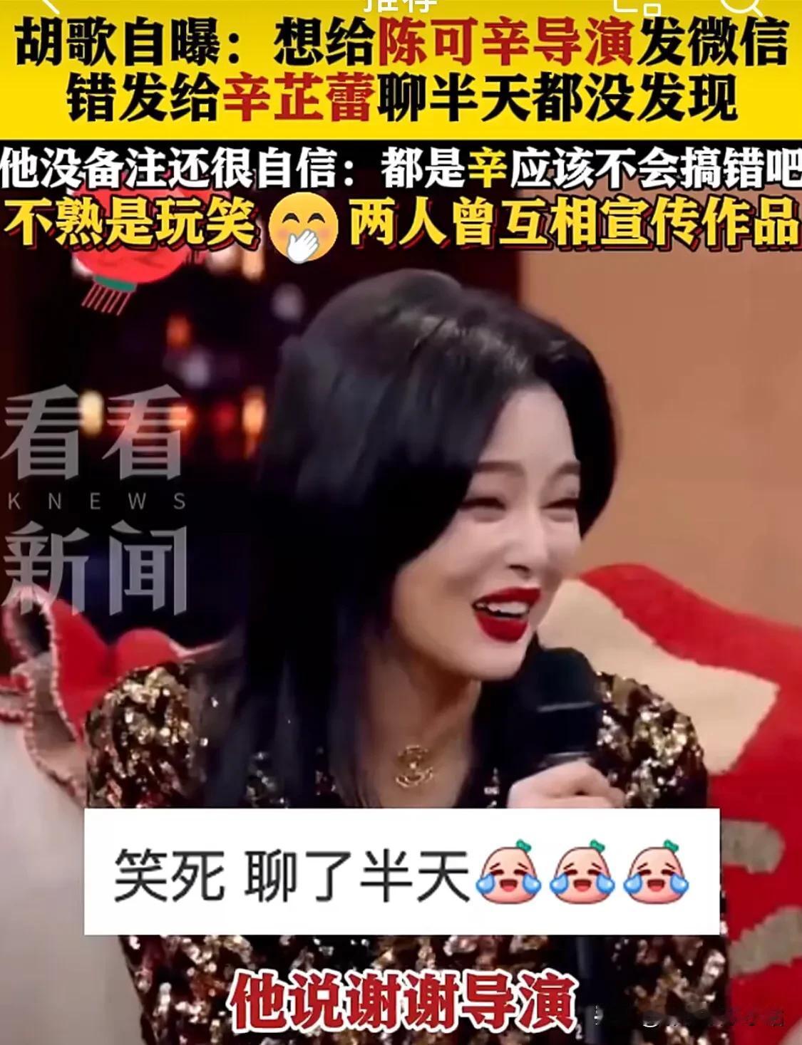 哈哈哈,胡歌微信没备注,给陈可辛导演发微信,结果发错给了辛芷蕾。 胡歌:导演,我看了您的采访,感触很深! 辛芷蕾:你是一个特别好的演员,继续努力。 胡歌:我上一部戏演得还有很大进步空间。 辛芷蕾:没有没有,还可以,继续努力。 因为陈可辛和辛芷蕾的微信名都是一个“辛”子,胡歌就没有备注名字,看了陈可辛导演的一个采访,发微信过去聊天,没想到发给了辛芷蕾。 辛芷蕾其实第一句就知道胡歌发错了,逗他玩,还一直陪他聊天。 胡歌发错微信消息好笑程度 100%; 辛芷蕾陪聊下去好笑程度 10000% ;