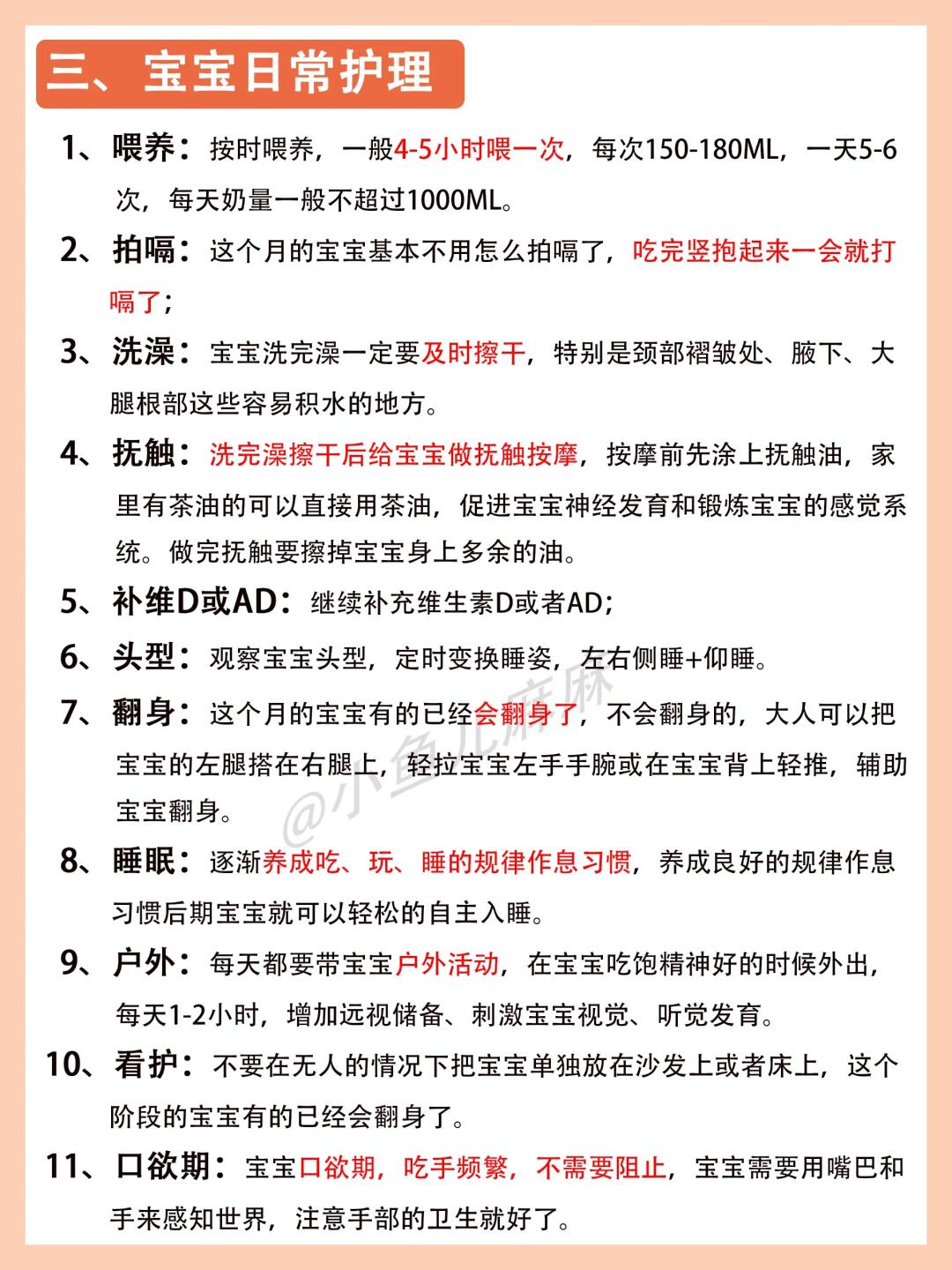 这里说的宝宝的第四个月~ 指的是宝宝的第90-120天❗️ 第四个月的宝宝~已经越来越好带啦! 这个月会有什么变化呢? 今天小鱼儿麻麻一文讲清楚 姐妹们可以参考哦❗️