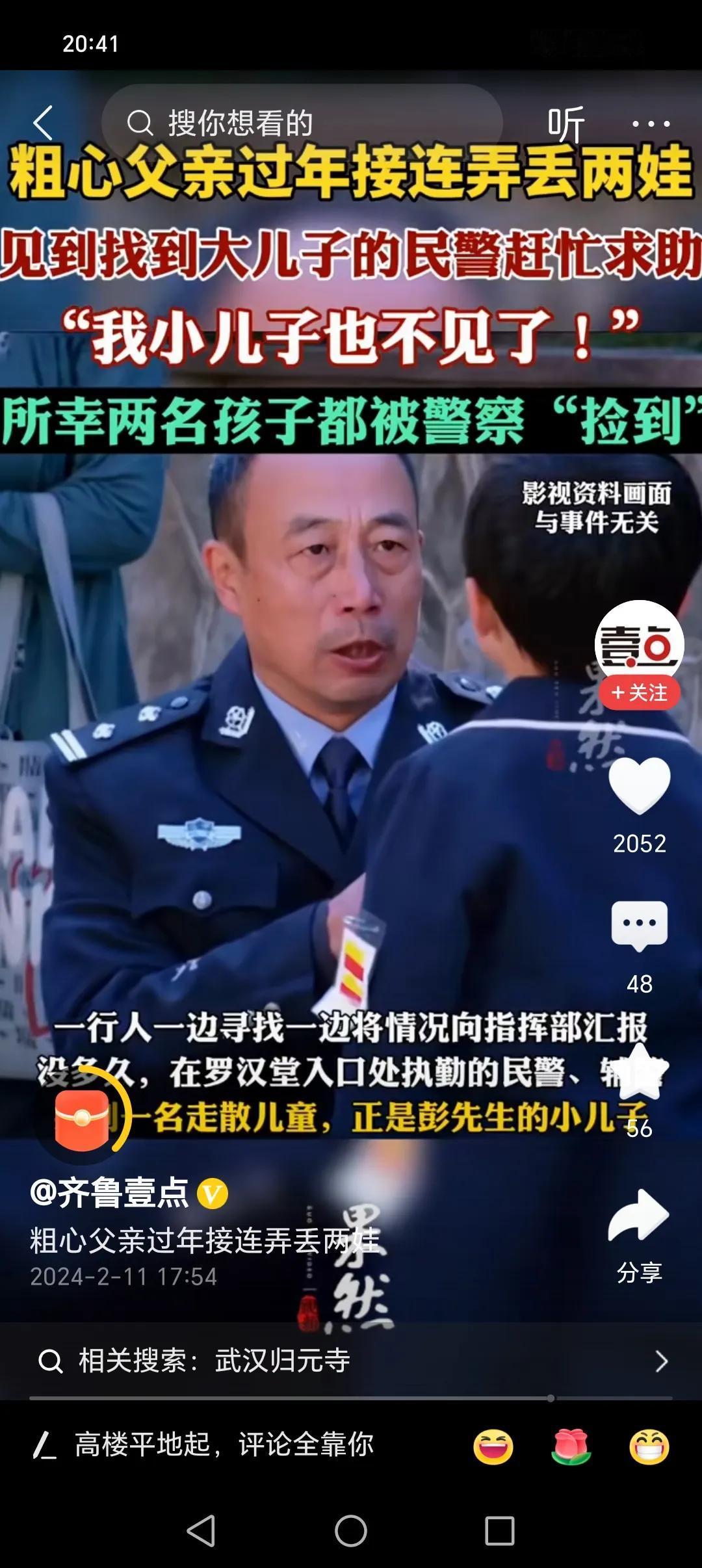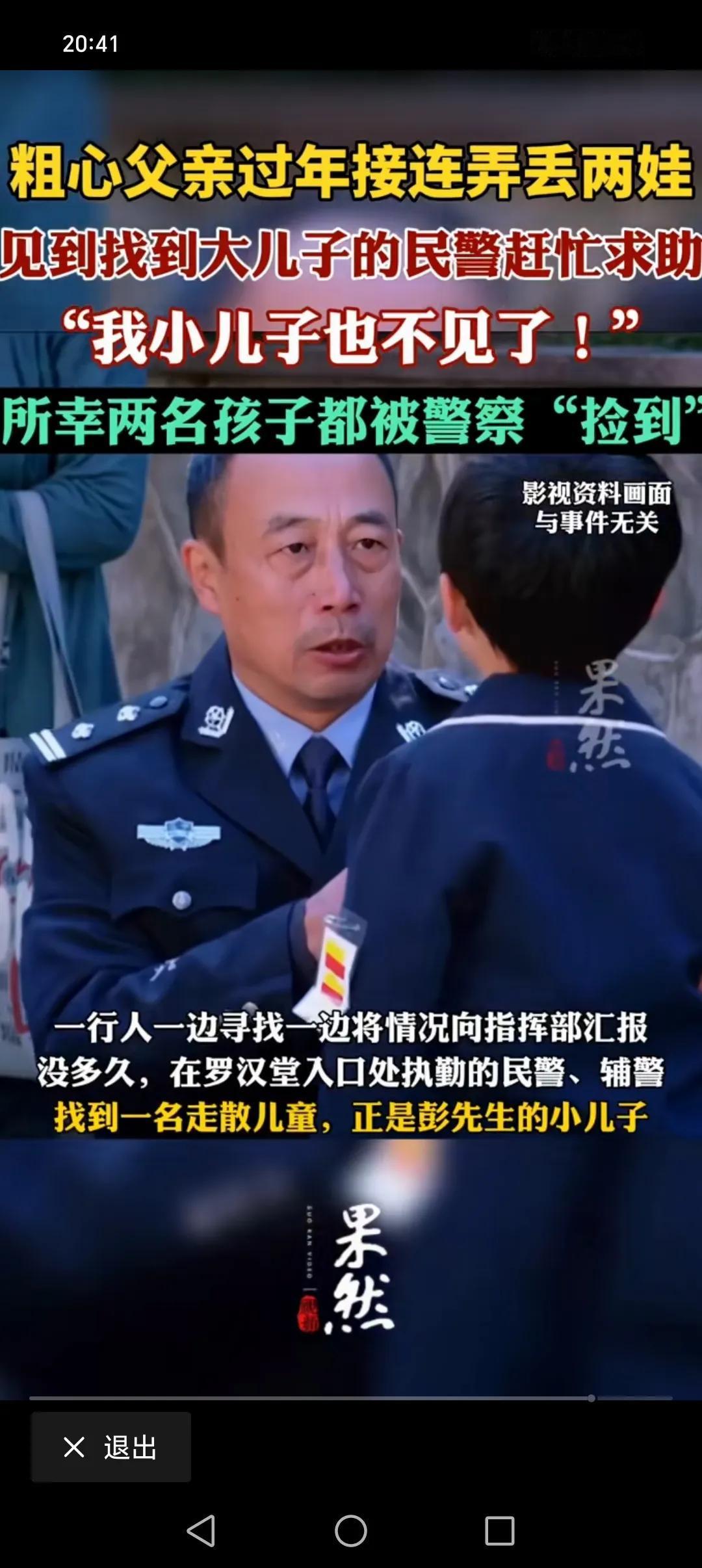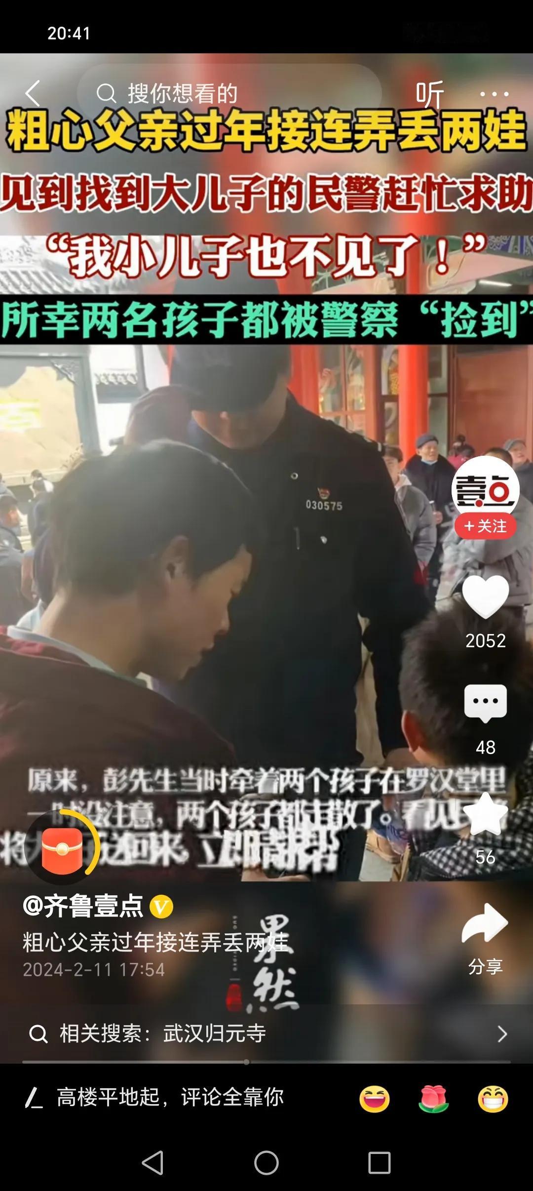 不得不服这个爹是个人才!一丢丢两娃,果然,没有危险的时候爹是最危险的,心大的离谱,丢了大儿又丢了二娃,我就怀疑,不知道他会不会走丢,知不知道回家? 2024年2月10日,龙年春节,大年初一这一天,武汉归元禅寺罗汉堂。 彭先生领着大儿子,二儿子就在这里丢了。 不得不说,这父亲可真是粗心大意,居然在几分钟内丢失了两个儿子。 罗汉堂人太多,彭先生一转眼的功夫,俩儿子都消失在他的视线当中,他肯定没有左手一个儿子,右手一个儿子。 当爹的和当妈的带娃就是不一样,当妈的肯定是左手大儿子,右手二儿子。 这当爹的肯定是哪个手也没有拉着儿子。 网友就说的好:没有其他危险的时候接,爹就是最危险的“生物”啊! 说实话,这大过年的,人多车多,丢一个孩子,就让人心里很难受,别说这一家人,一下子丢两个孩子。 不幸中的万幸,两名警察把孩子捡到了。 彭先生这一日如过山车,一惊一吓。 结局还是好的,虽然受到了惊吓,但俩孩子失而复得,有惊无险。 不得不说,这个爹真是个人才呀,能同时丢掉两个儿子。 粗心大意的爹,没有把自己丢了就不错啦! 不能指望他能照顾孩子,能把自己照顾好奇,已经是奇迹。 这大过年的,上演这一出丢孩子事件,有些后怕。 这样的惨剧发生过很多,都是粗心大意,让孩子丢了,让人贩子得逞。 我现在越来越发现,这当爹的带娃不靠谱,太大意了。 朋友们,你们说这样子的爹,他带娃他妻子放心嘛?