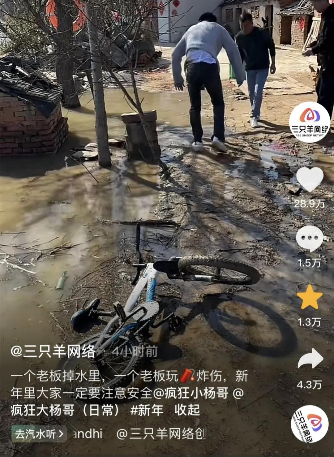 突发事件!大小杨哥同时出事,一个被鞭炮炸伤,一个掉进水里。真是亲哥俩,出事都得一起一块。这走亲戚,有些乐极生悲的感觉。近日,千万网红大小杨哥出事,大杨哥被鞭炮炸伤,小杨哥骑车掉入鱼塘!幸亏都没事。 2月12日,是大年初三,走亲戚的日子。 千万网红大小杨哥,两位大老板大杨哥和小杨哥一起去走亲戚,在路上,两兄弟却意外的出了事情。 出事反常,令人忍俊不禁又有些怀疑。 先是小杨哥,他骑着一辆非常小的自行车走在农村的树林子里。 不知道是骑车技术太差,还是故意,小杨哥直接骑进了村外的水坑里。 可想而知,小杨哥掉到水坑里浑身湿透。 到了岸上,又发现手机也掉进了水坑里,脱了衣服,再次下水进行打捞手机,视频中,好几个人都在帮忙打捞手机。 人多力量大,手机找到了,人也冻坏了。 不知道小杨哥回家后会不会感冒发烧,大冬天的,在水里很长时间,估计会感冒发烧。 幸亏这几天天气比较暖和,温度比较高,没有那么冷。 而大杨哥就没有这么幸运啦,小杨哥开自行车进水坑时,大杨哥还在做吃瓜群众,哈哈大笑。 下一秒,大杨哥就笑不出来了。 开开心心放鞭炮,却不小心被鞭炮咬了一口。不知道咋放的,大杨哥直接被鞭炮炸伤了手腕,半个手臂被医生包扎起来。 从照片中看到,大杨哥手部被炸伤的的面积还是挺大的,炸伤的是左手,右手还能拿着手机回复信息。 大杨哥左手包扎的像个大熊掌,右手还有医院里面留的滞留针,但大杨哥精神状态非常好,没有影响他的状态。 大小杨哥在过春节走亲戚的时候,都出了突发事件,真是一对难兄难弟。 大小杨哥的事情,也给我们提了醒,春节期间,安全最重要,玩耍时候,一定要注意安全。放鞭炮的时候,更要注意安全。 特别小朋友们,在放鞭炮的时候,更要小心,小朋友尽量别放鞭炮,以免伤了自己。 我邻居一个9岁的男孩子,就是因为放鞭炮,把右手的大拇指,无名指,中指,都炸没了,很惨。 #大杨哥被炸伤# #小杨哥掉沟里# #大杨哥炸伤手# #小杨哥摔一身水# #小杨哥周星池# #小杨哥一身水# #疯狂小杨哥。# #年度大奇葩事件#