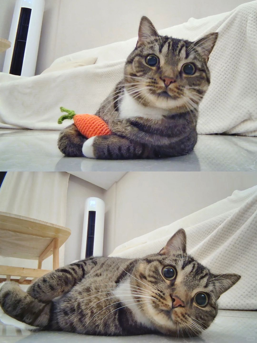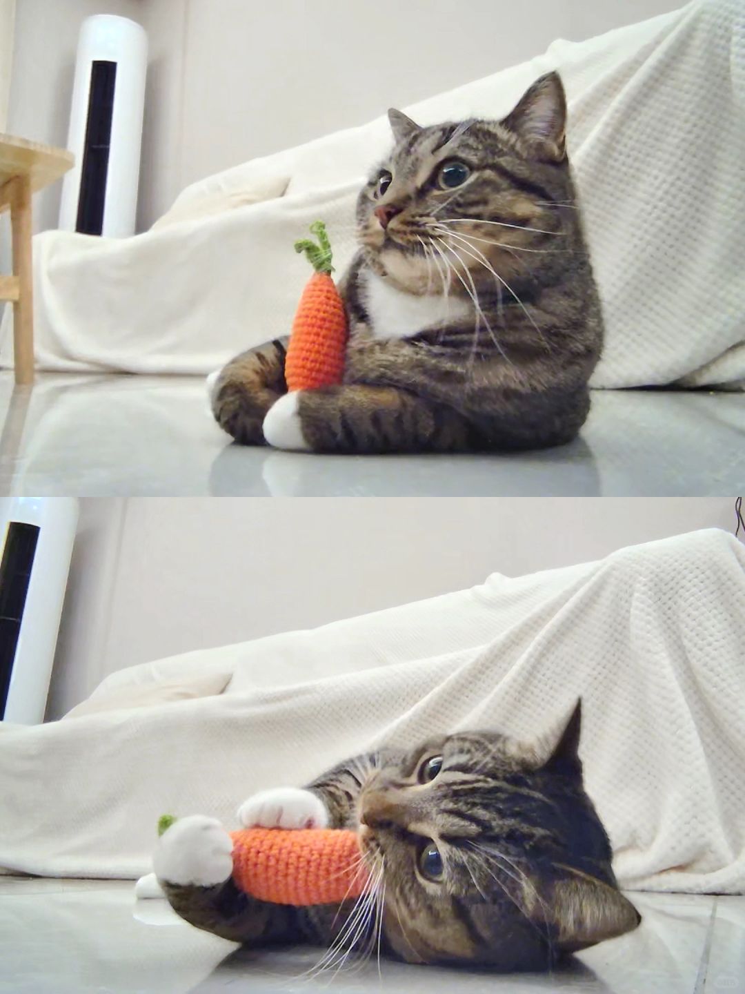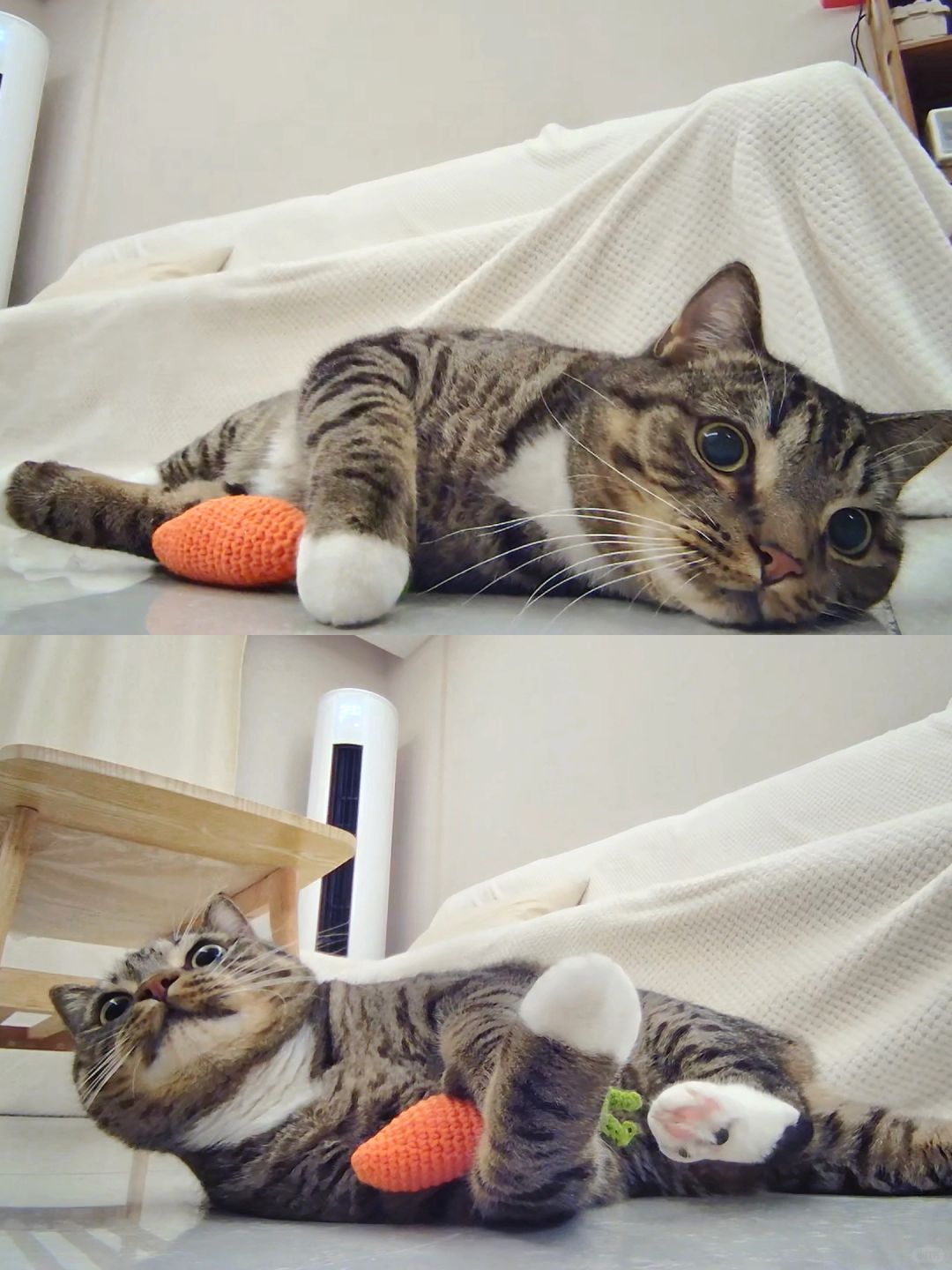 🐱帮不上什么忙所以就自己乖乖地在家玩玩具🥕,我叫它它就眼巴巴地看着摄像头[皱眉R],小猫咪也会想念铲屎官吧!
