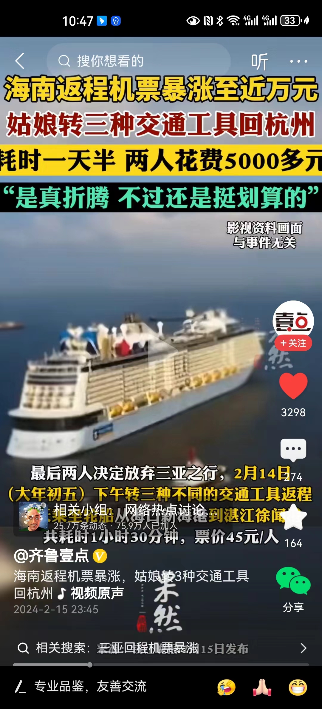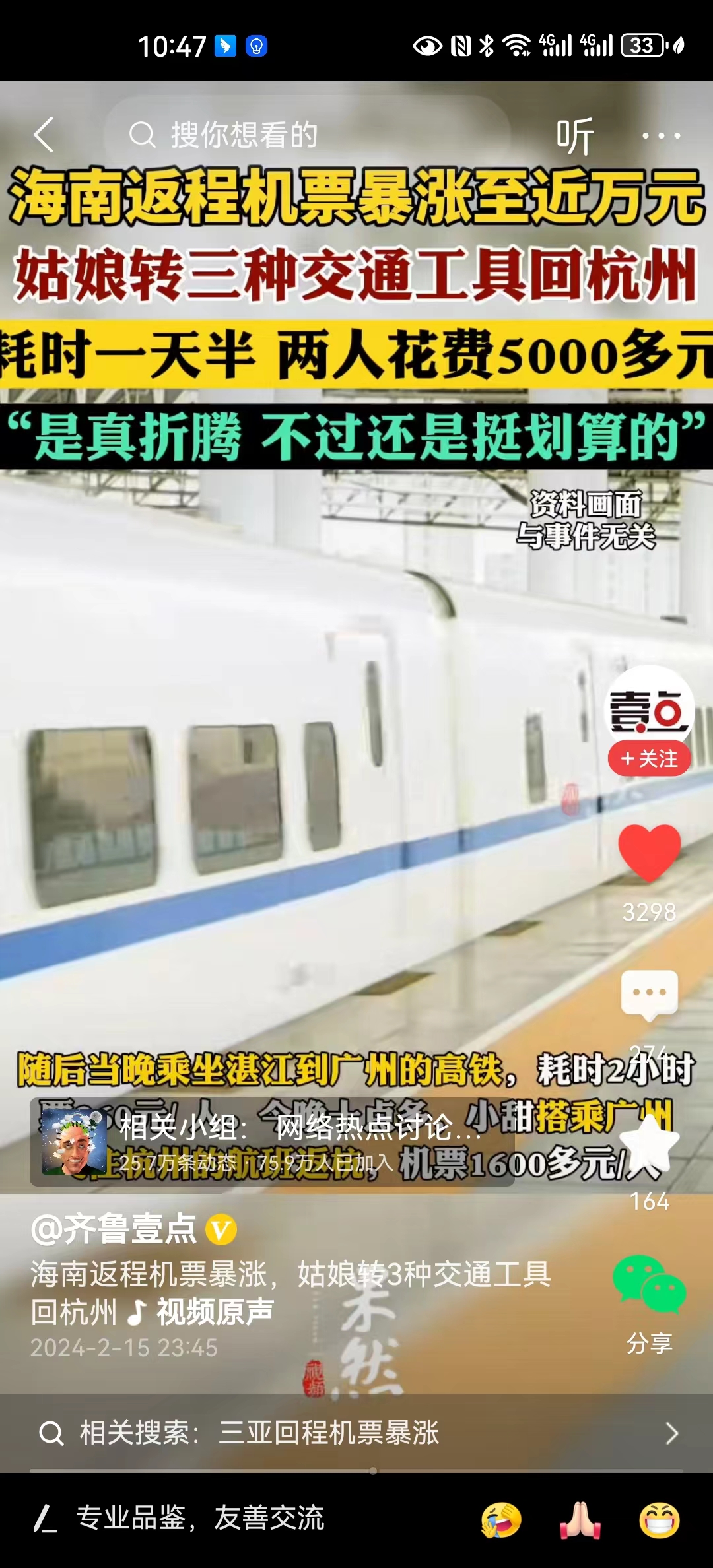 故事的主人公,在发现三亚返程杭州的机票价格已经高达五六千元以上之后,开始做各种的攻略,最终的选择就是走了以下的路线。先从三亚坐高铁到海口,再从海口乘坐渡海轮船到湛江,之后从湛江再坐高铁去往广州,最终从广州在乘坐航班飞机到杭州!三种交通工具,四段行程,让人从三亚返回杭州的过程充满了黑色幽默!