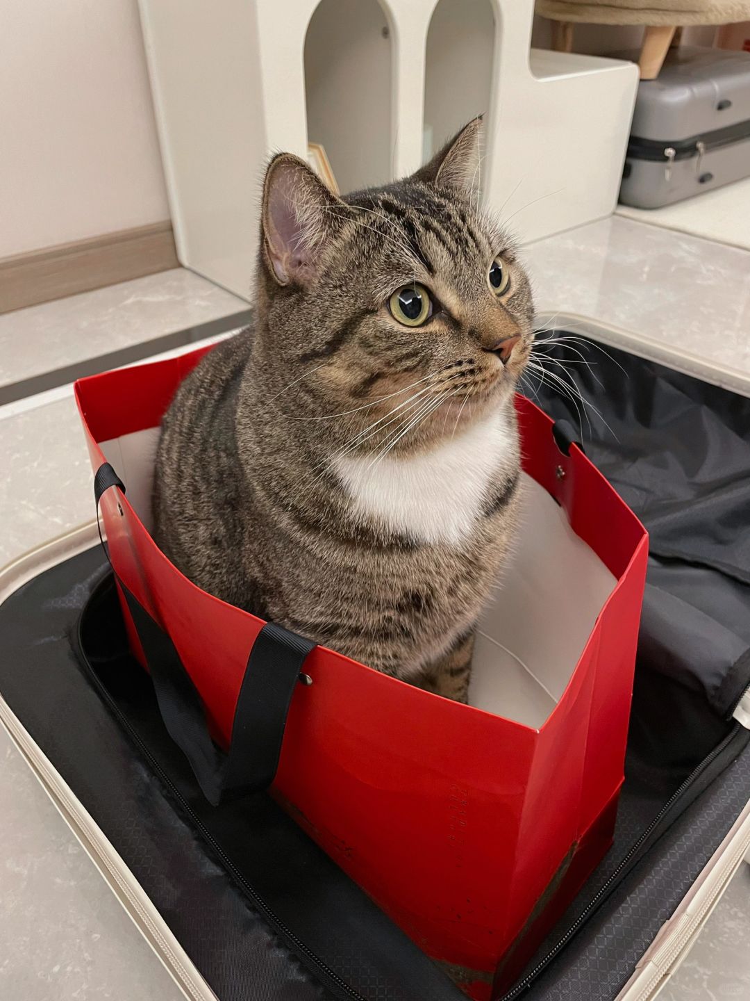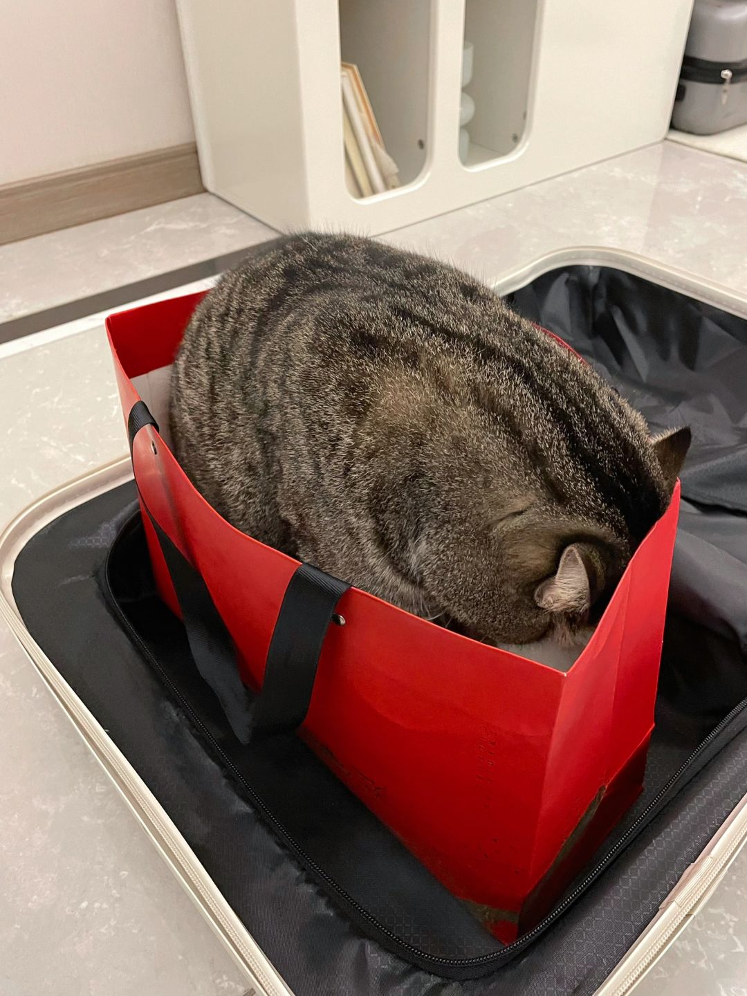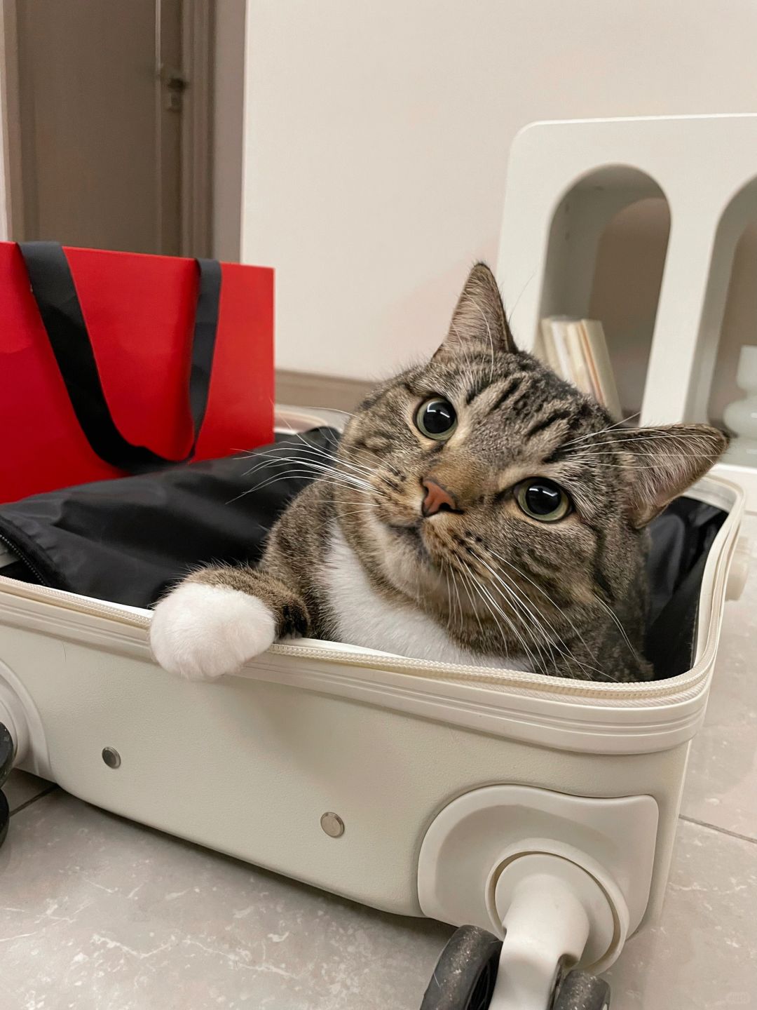 过完年回家啦!昨晚行李箱一放饼饼就钻过来了,🐱:“下次不许离开家这么久了(゚ペ)!”