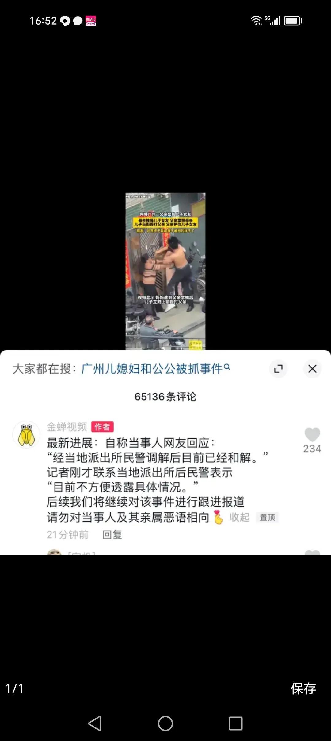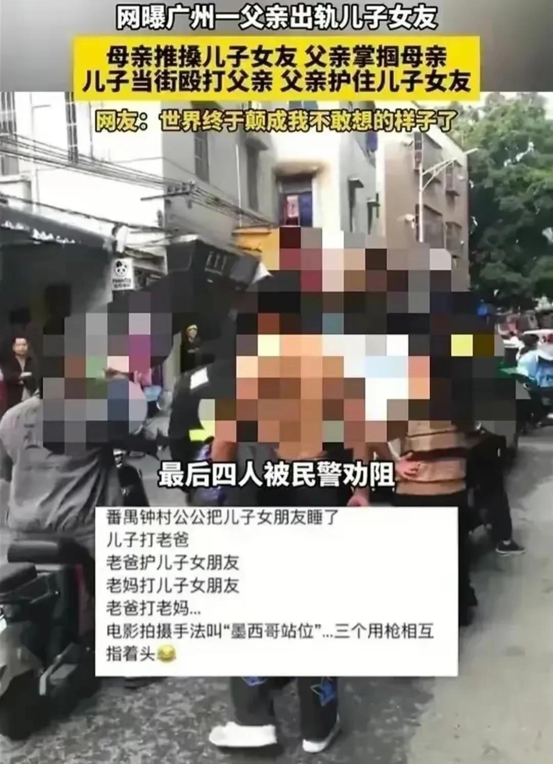父亲出轨儿子女朋友的最新进展:双方已经和解。经过当地派出所民警调解,双方和解。这为了一个女孩把一个家搞成了一个笑话,一个女孩成功把这个家搅散了,近日,广东广州番禺钟村,网传一男子发现父亲与她女友有不正当男女关系后,与母亲一起在大门口处堵住二人。 这个问题很雷人,父亲出轨自己的女朋友,这一个事情就让我们消化好几天,毁三观的问题。 现场视频显示,儿子和母亲在门口堵住了父亲和儿子女朋友,不言而喻,两人是已经实锤了。 母亲一看,这还了得,她火冒三丈,一时冲动打了儿子的女友。 这丈夫一看,心疼啊!赶紧护着儿子的女友,并殴打自己家妻子。 本来就一肚子气的儿子,看见自己的父亲居然打自己的母亲,明明父亲做错了事情,还不知道悔改,还要打自己的母亲。 这儿子是气不打一处来,心里热乎乎,这火都把老房子着了,儿子一生气,立即上前殴打父亲。 这搁谁都要生气,睡了自己的女朋友,还有打自己的母亲,这谁能受得了。 随后父子俩就撕打在一起,都动了真气,动起手来,都没有存力气,而且都用了狠力气。 打架的时候,不是父子,已经是仇人。 直到父子两人倒在地上,气喘吁吁但都互不松手。 母亲和女孩也没有闲着,母亲则与女友撕打在一起。 真是一场混战,直到有人报警,直到民警到场后把他们拉开。 一家四口,一起进了派出所。 最新进展:经过当地派出所民警的教育和调解,双方已经达成和解。 这是一个好消息,最起码一家人没有因为这个事情被拘留,大家都知道,打人是犯法的。 但是,不知道这三口之家,会不会再和睦。 这儿子和女孩子是不是还能在一起? 这老父亲和女孩子是不是将来还有联系? 这母亲会不会原谅这父亲? 最重要的是,这儿子会不会原谅自己父亲做的这个荒唐事?#那些出轨的事# #这视频太扎心了# #婚姻事件真相# #网友奇谈亲戚# #结过婚的看过来# #情感故事大赏# #天南地北大拜年#