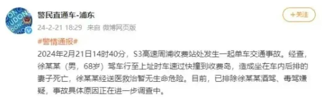 68岁的老徐万万没有想到,就因为自己把车开的贼快,要了自己妻子的命,自己去却好好的没有什么事情,这辈子老徐要活在自责中,他在高速收费站突发车祸,导致妻子当场离世,老徐是痛不欲生!可这又有什么用?谁让自己不慢点开车。 事情发生在2月21日下午14点40分,上海沪奉高速的周浦收费站,68岁的老徐带着妻子在高速收费站发生了一起惨烈的车祸。 这个车祸让老徐感到了心痛,我们外人看了,都要难过。 视频我看了,老徐把汽车开出了高铁的速度。 只见一辆轿车在高速上疾驰,径直撞上了收费站,还停不下来,直接再继续开。 老徐在前面捡了一条命,可他妻子没有他的如此幸运,坐在后排的妻子因伤势过重,当场离世。 老徐因被及时送往医院,侥幸生还,把命捡了回来。 为什么坐在后排的妻子会死亡?而坐在前排的司机却没有事情? 老徐的妻子为什么没有坐副驾驶? 老徐这辈子要活在深深的内疚里,自己开车把老伴丢了,这是人生的不幸。 没办法,这就是命。 我估计,这以后啊,老徐再也不敢开快车了。