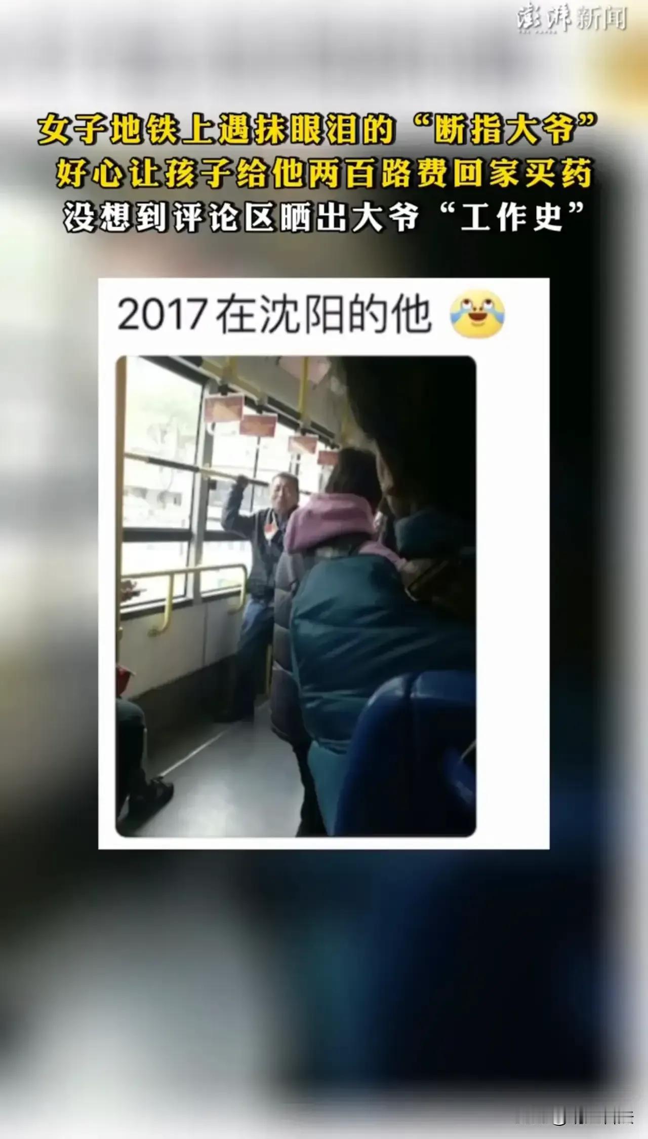 难道真的大爷变老了,变坏了吗?近日,黑龙江一女子,就遇见一个大爷变老了变坏了的事情,她带着孩子乘坐地铁出行时,偶遇一个自称断了4根手指的大爷。 只见这大爷左手用纱布包着,还有血渍,好用布条掉在脖子上,乍乍一看,标准受伤的样子,而是外人一看,如假包换。 这大爷还一边抹着眼泪、一边说自己有多可怜,说的令人心酸。 大爷说到动情处时,就说自己多么多么可怜,多么多么没人管,说自己没钱买药、没钱吃饭,没钱回家。 女子是个心善良的人,看不得别人可怜,她出于好心,让孩子递上去200元,让大爷当路费回家买药。 女子就把这个事情拍成视频发到网络上,视频发出去后,却发现毁了三观,自己上当受骗了! 原来,这大爷是惯犯,好几年的惯犯,都是同一个动作,同一个药方,同一个目的。 大爷2017年的手就受伤了,一直到现在都没有好。 网友说:2019年还断着呢,2024年又断了。 网友都是有图有真相。 哎呦喂,原来这大爷是专业演员,演的都是专业断手这个戏码。 不得不服,这大爷还是这大爷,这手还是这手。