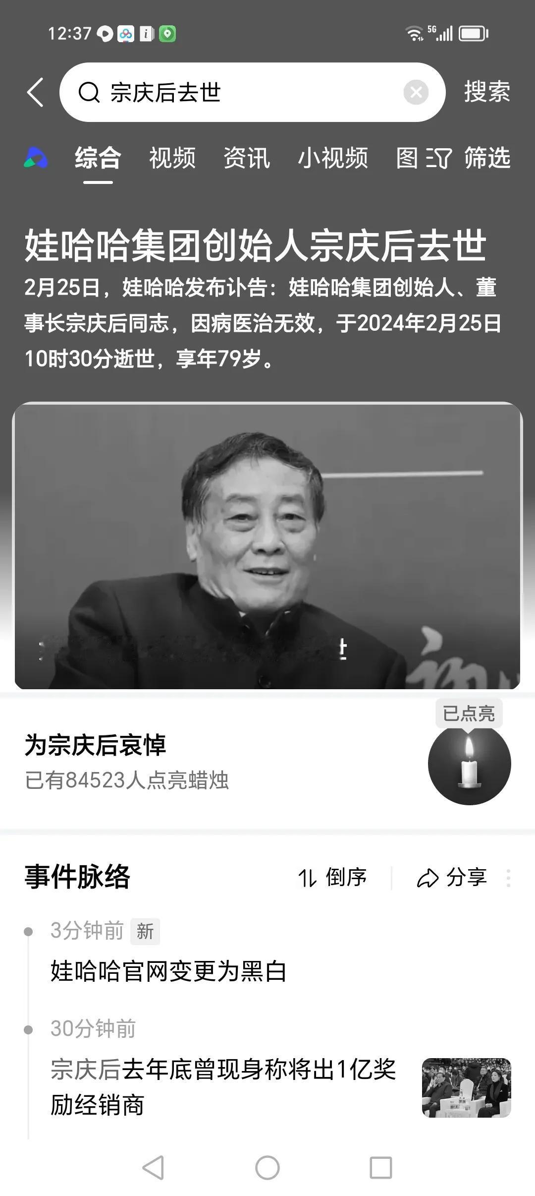 他走了!永远的离开了我们,我们小时候最喜欢喝的娃哈哈创始人宗庆后走了。娃哈哈集团创始人、董事长宗庆后,因病医治无效,于2024年2月25日10时30分逝世,享年79岁。 前几天,新闻报道,说他生病住院,住进了ICO,曾有网友说:看来病情很严重,就是这几天的事情,我们还都骂他乌鸦嘴,没想到让他一语中的。 看来这网友知道宗庆后是啥病,所以才这么说。 一代企业家走了,闺女宗馥莉接过来这工作的接力棒,继续为娃哈哈集团贡献工作的热情。 我们记忆中的娃哈哈,永远是最美好的时光,最好喝的童年陪伴。 愿宗庆后董事长一路走好![祈祷][祈祷]
