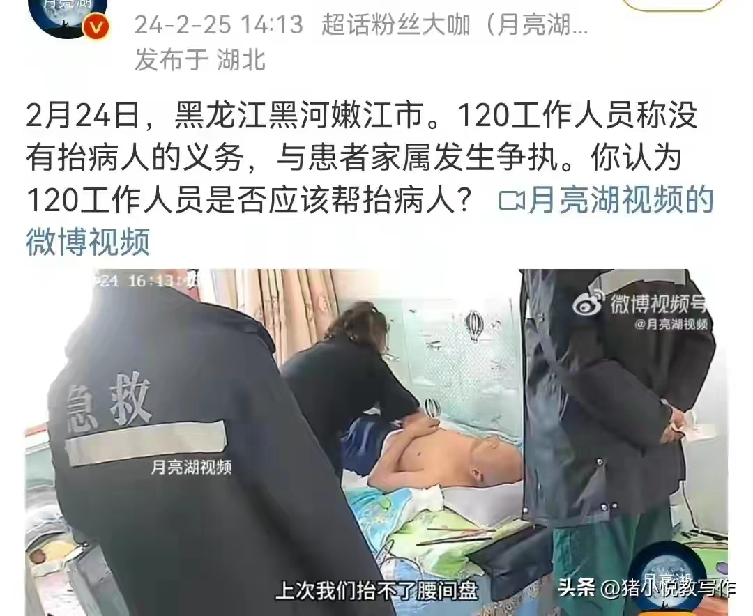 在2月24日下午4:00,发生在黑龙江黑河嫩江市,家中老人生病了,女子打了120急救电话。没想到的是,救护车来了以后,医生不愿意抬病人。一开始说涉及到腰椎的病人,他们抬不了,后来就直接说没有这项业务。这真的是让大家大呼意外!