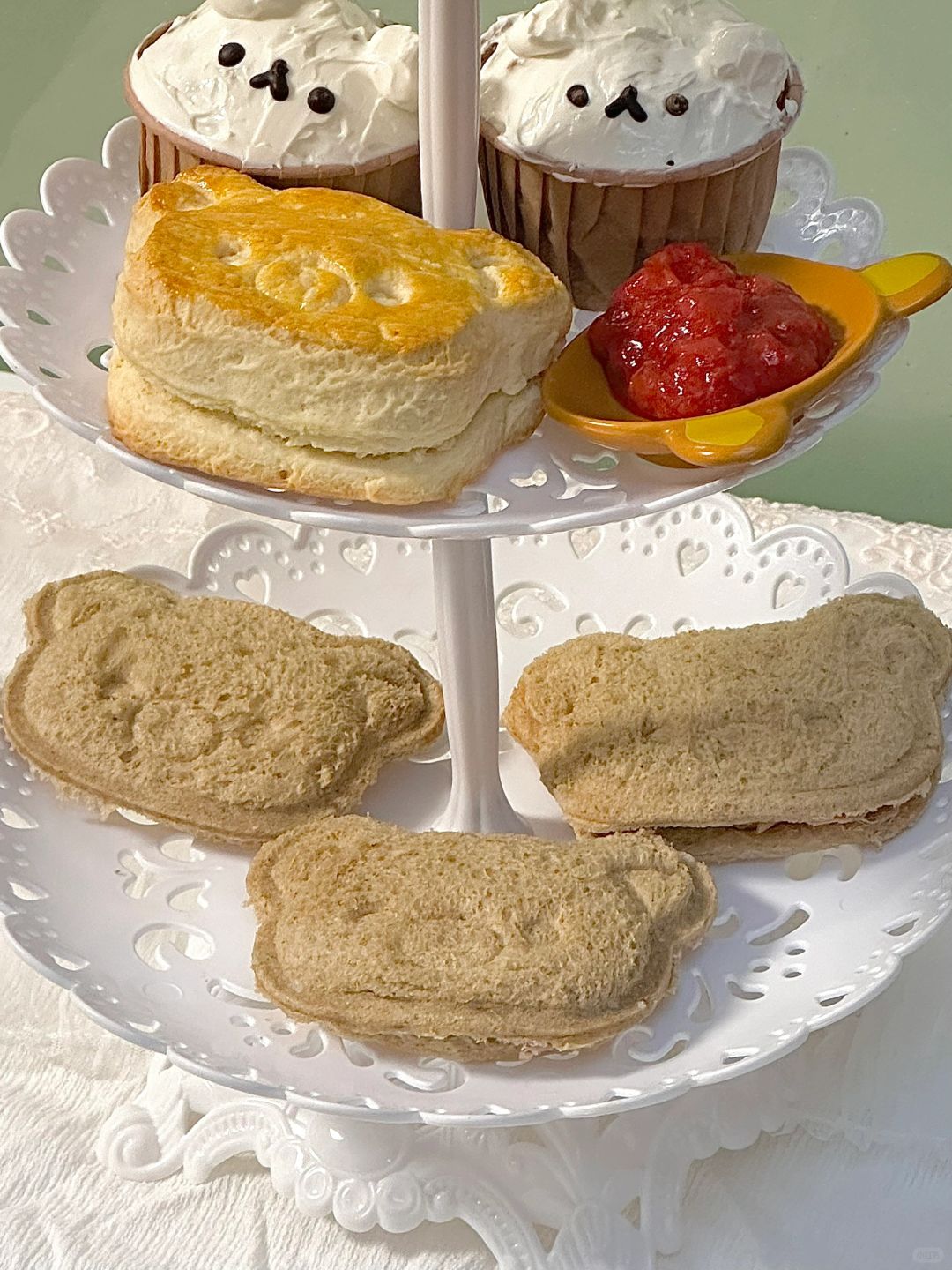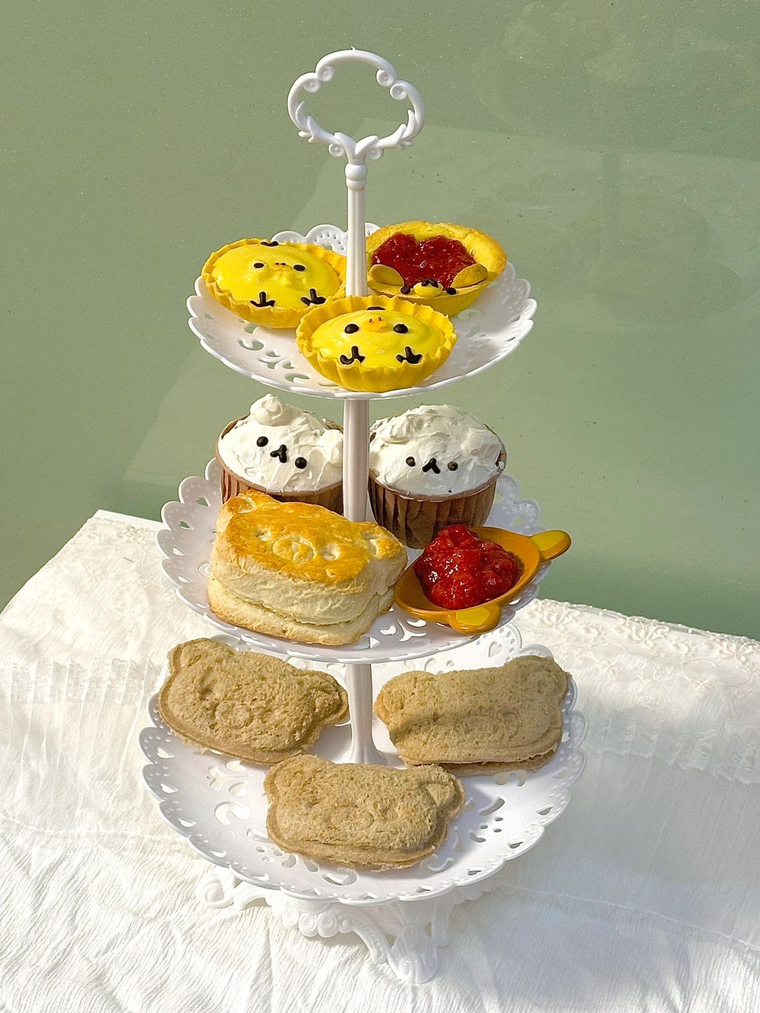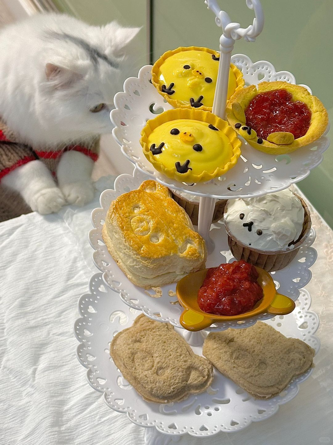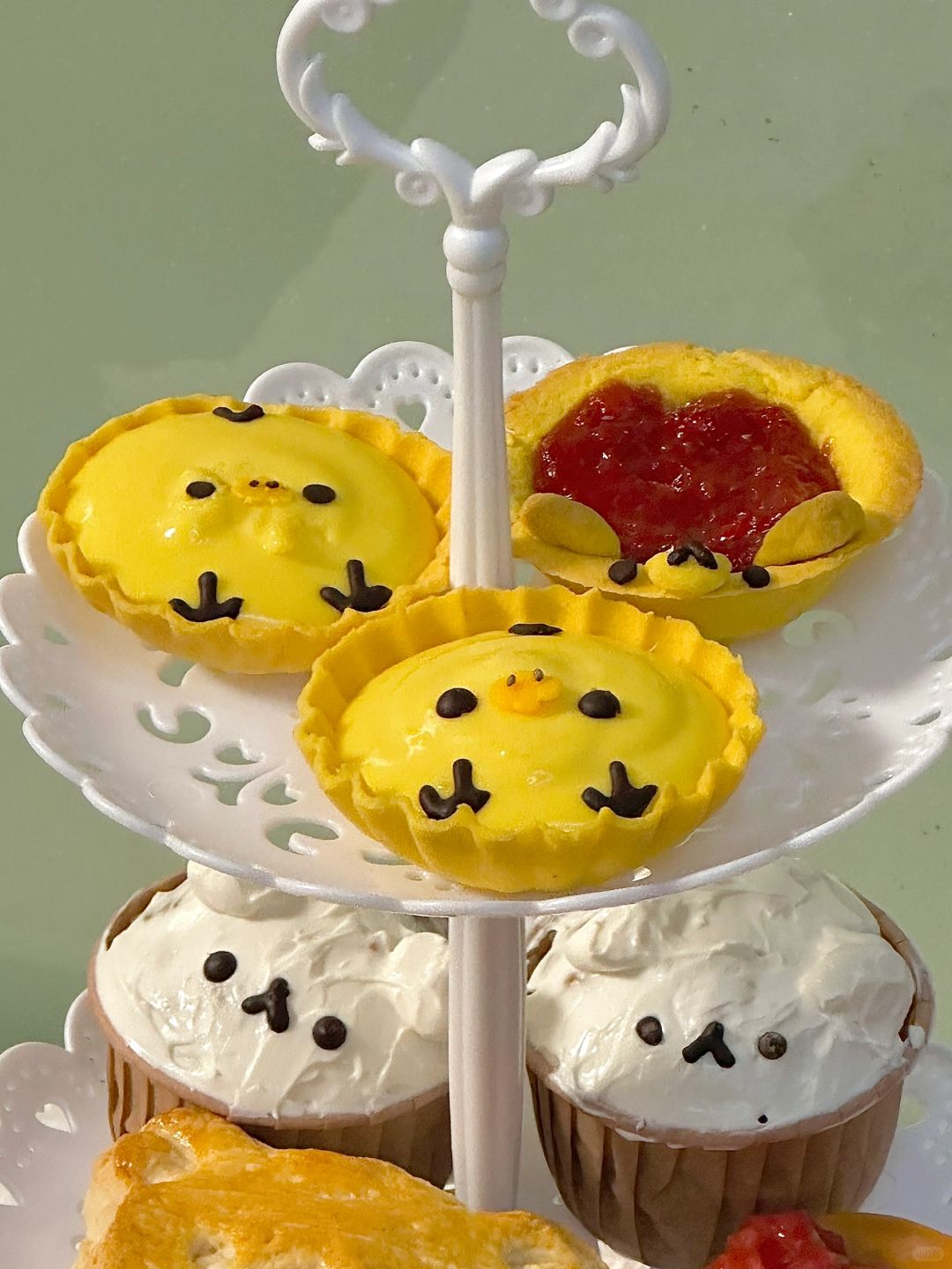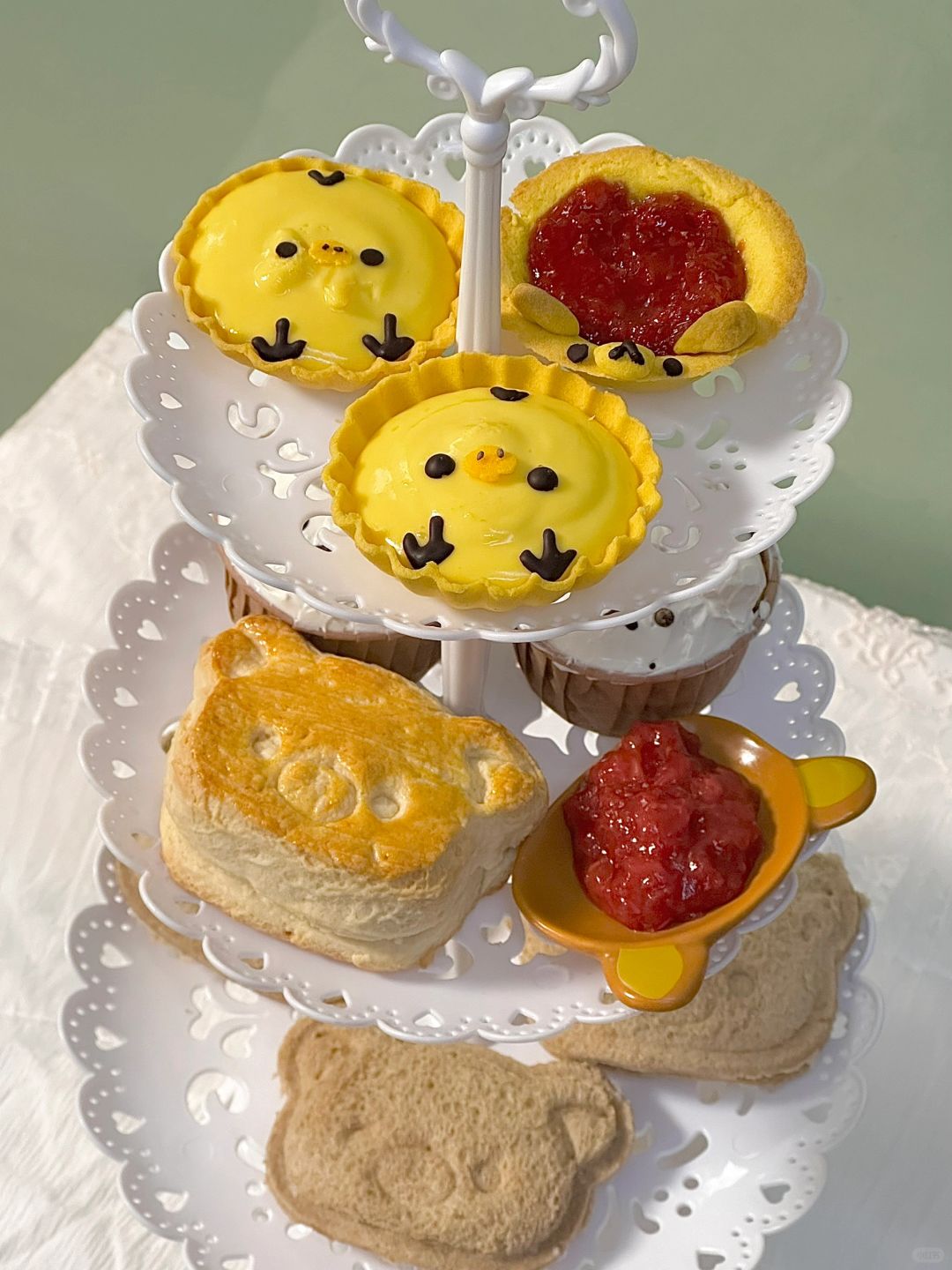 1.挞壳面团按压在模具中戳洞,并做出耳朵嘴巴,加入草莓酱一勺,180度烤18分种