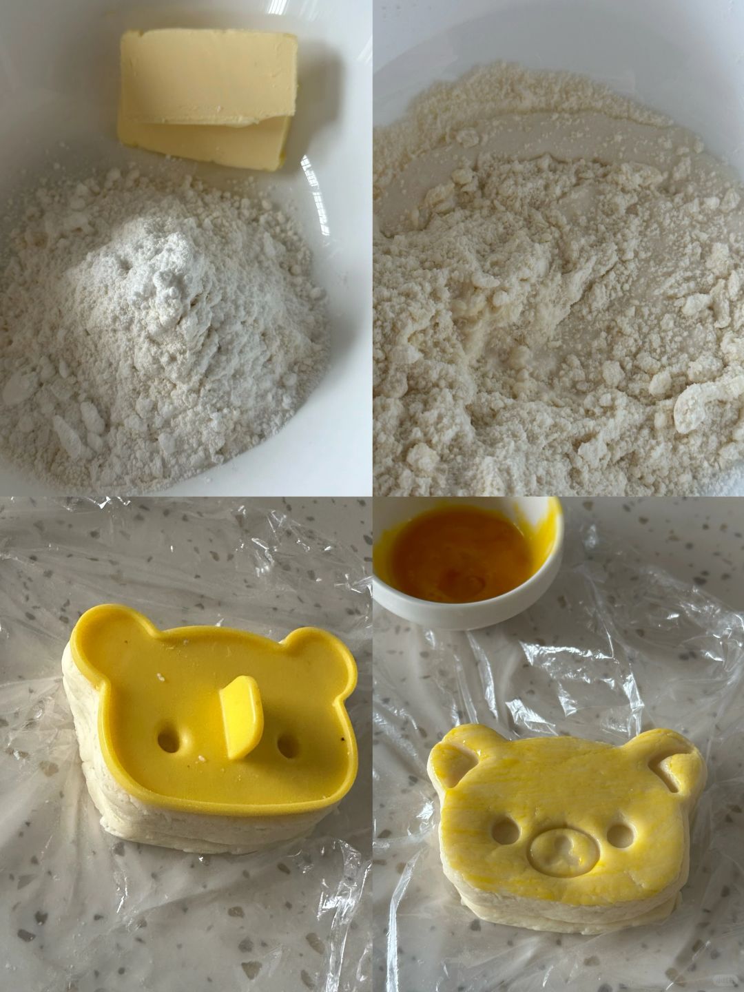 3.取出擀扁模具按压出轻松熊(我没有按压的模具就用剪刀剪的),再用模具压出轻松熊表情,刷上蛋黄液,180度烤20分钟