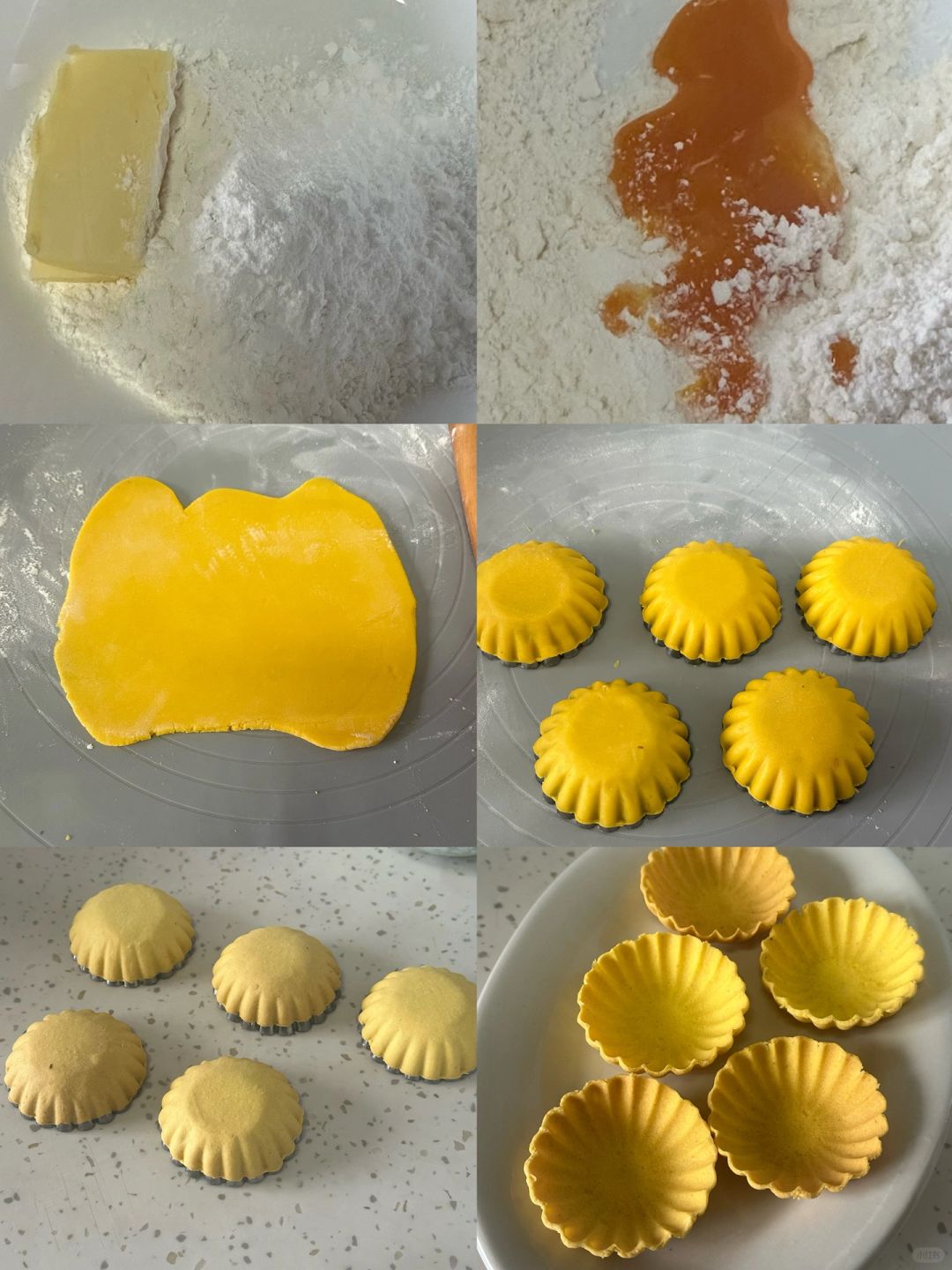 1.挞壳配料除蛋黄外搓成细沙状,加入蛋黄揉成团,擀扁后反扣在模具上,压实,另外再重一个按压后修掉边角再取下,150度烤20分钟备用