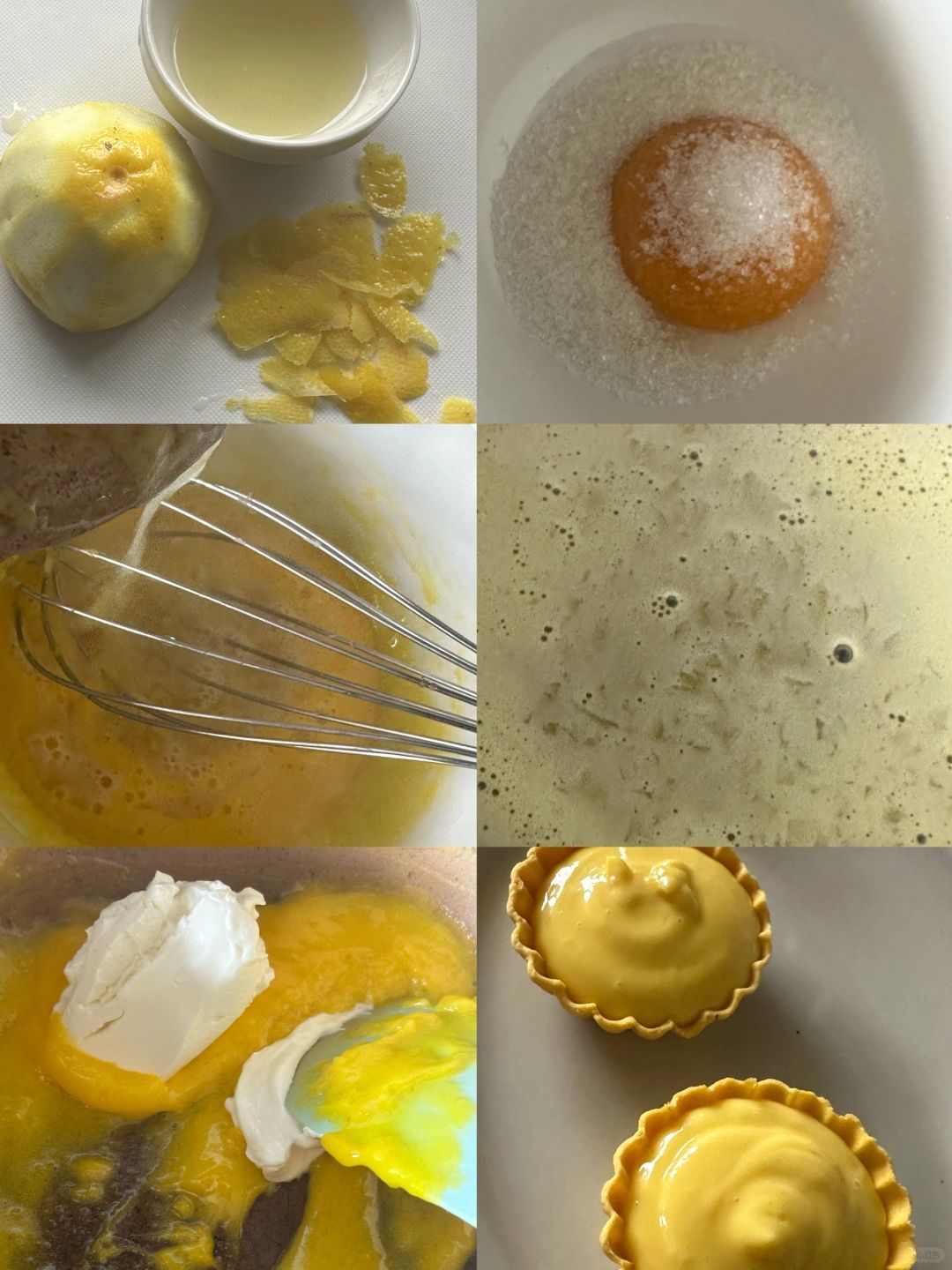 柠檬挞馅:一个蛋黄、半个大个子柠檬汁与皮屑、25g糖、35g奶油奶酪