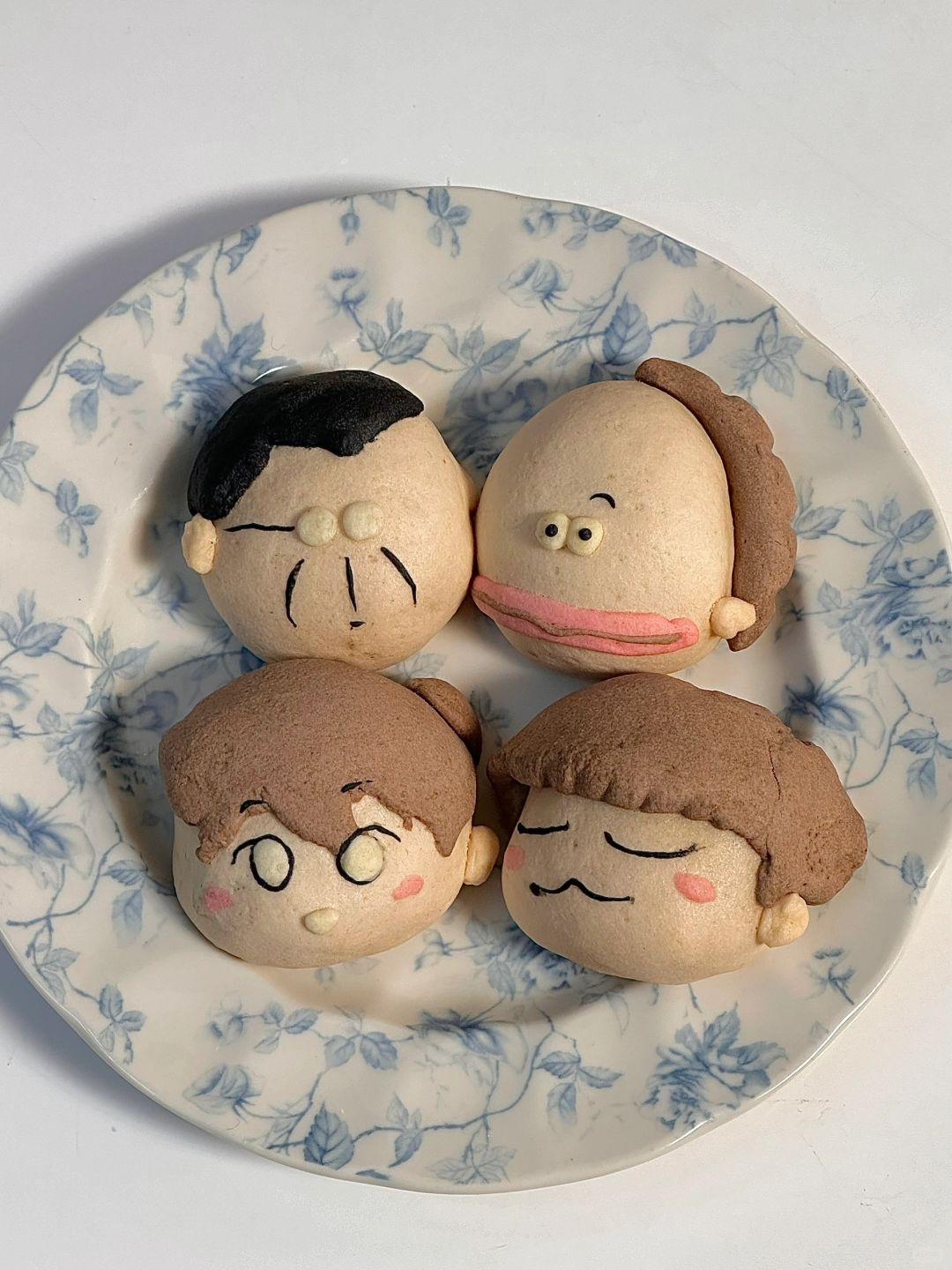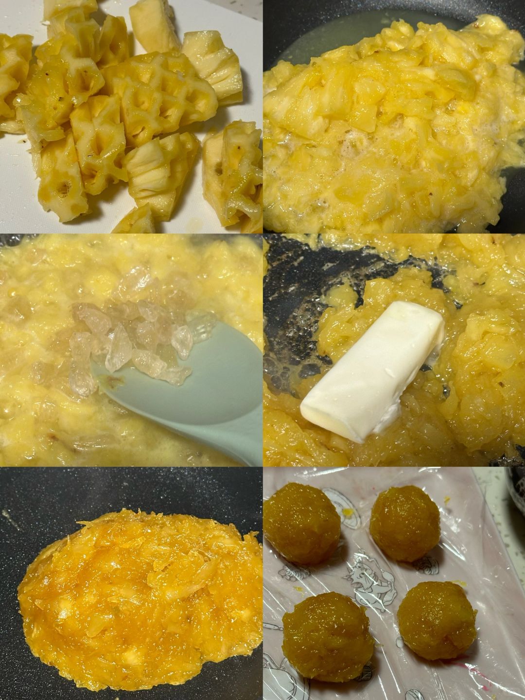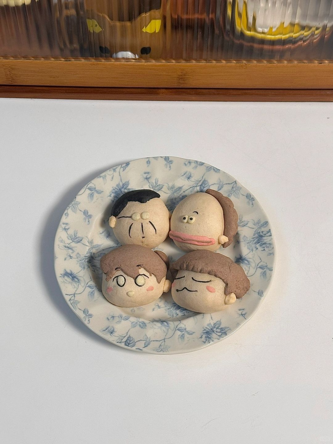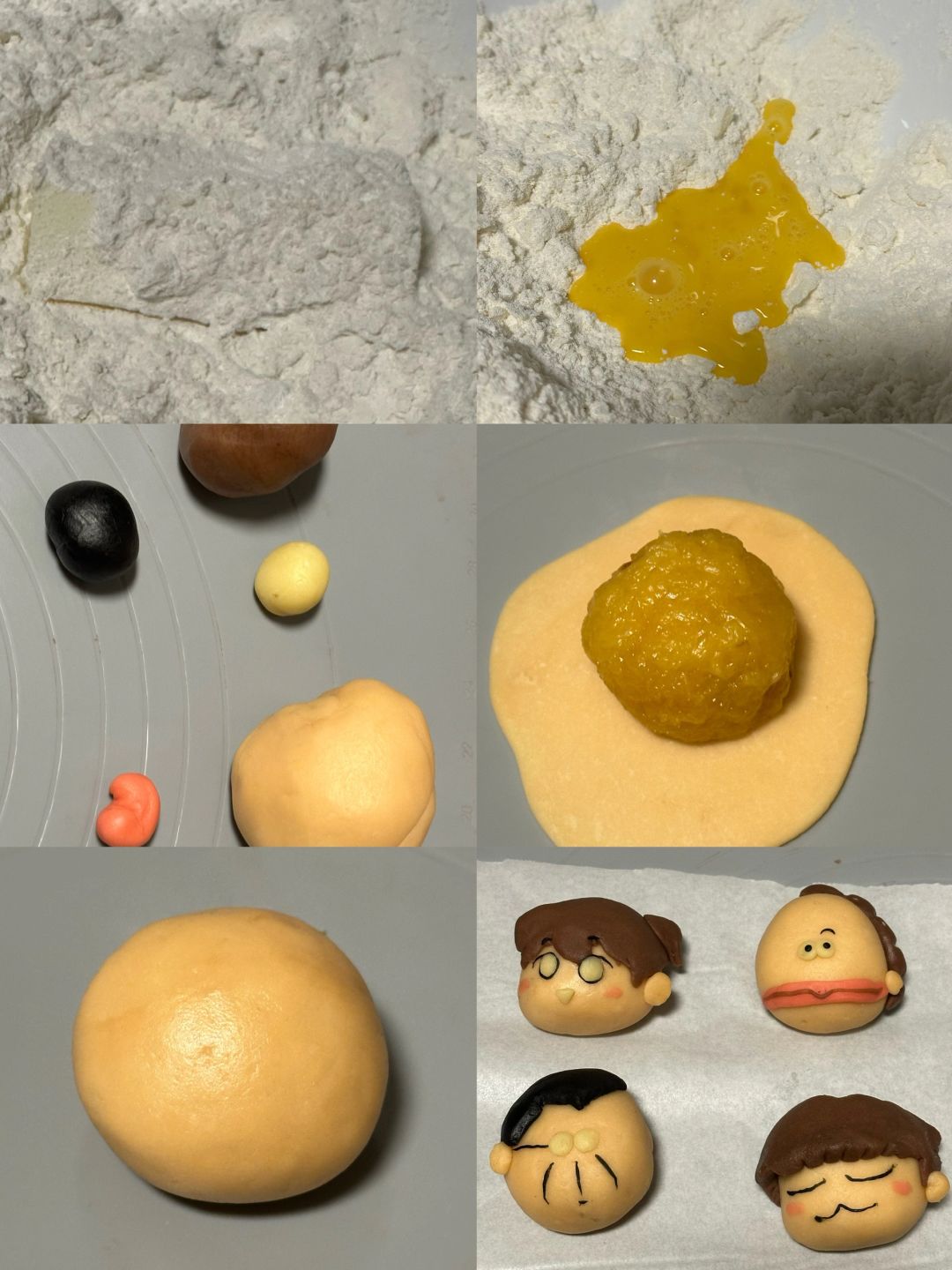 前几期做了花妈单人版,有小伙伴想要看一家人,所以这次做了一家人哈哈哈,不过调色好像有点淡 配料: 馅:一个菠萝、一些冰糖(根据自己菠萝甜度来)、一小块黄油 皮:33g黄油、95g低筋面粉、35g全蛋液、30g糖粉、调色(可可粉、红色色素、黄色色素、黑色色素) 1.菠萝切去硬心捣碎,放入锅中加入冰糖炒干水份,加入一块黄油炒至馅料,晾凉后搓成球(大约35 g一个)冷冻备用 2.皮配料除蛋液后搓成沙状,加入蛋液揉成团,分份调色 3.肤色取20g擀扁包入馅收口捏紧,装饰上细节 4.烤箱预热180度烤20分钟