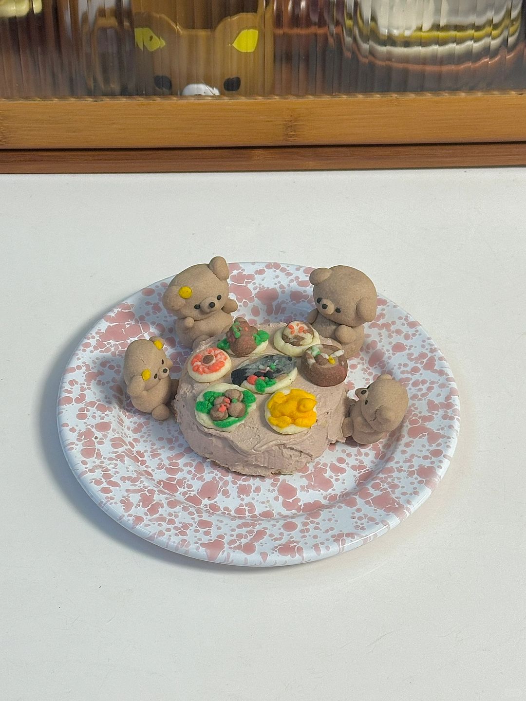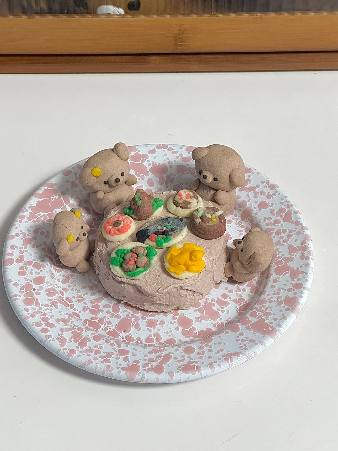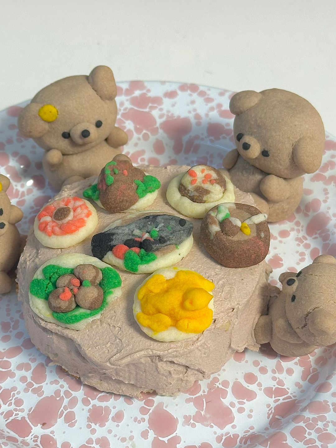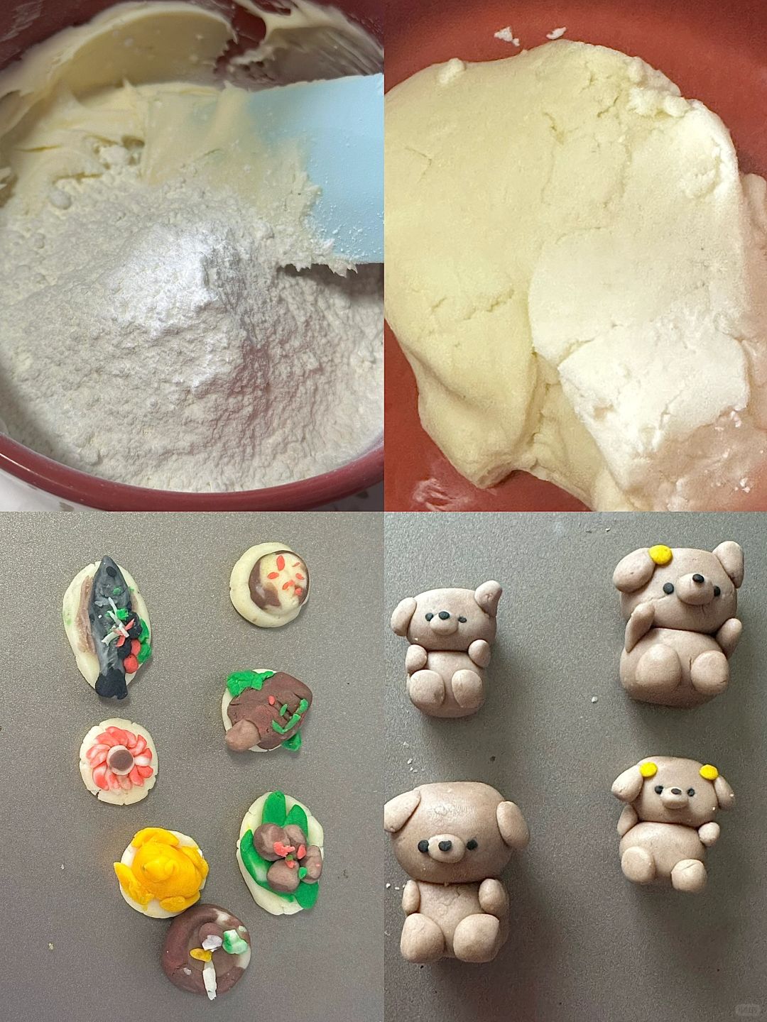 1.黄油软化加入糖粉拌匀,再加入饼干淀粉和面粉混合成团(如果有点干可以加一点点水),分份调色塑形,菜部分烤5分钟、小狗狗部分烤12分钟(仅供参考)