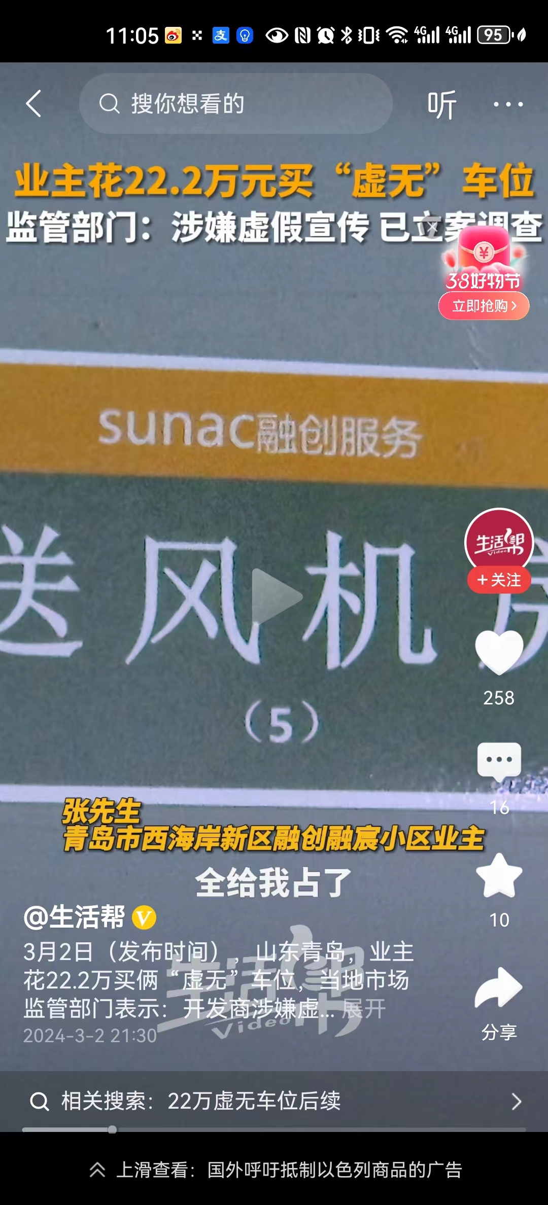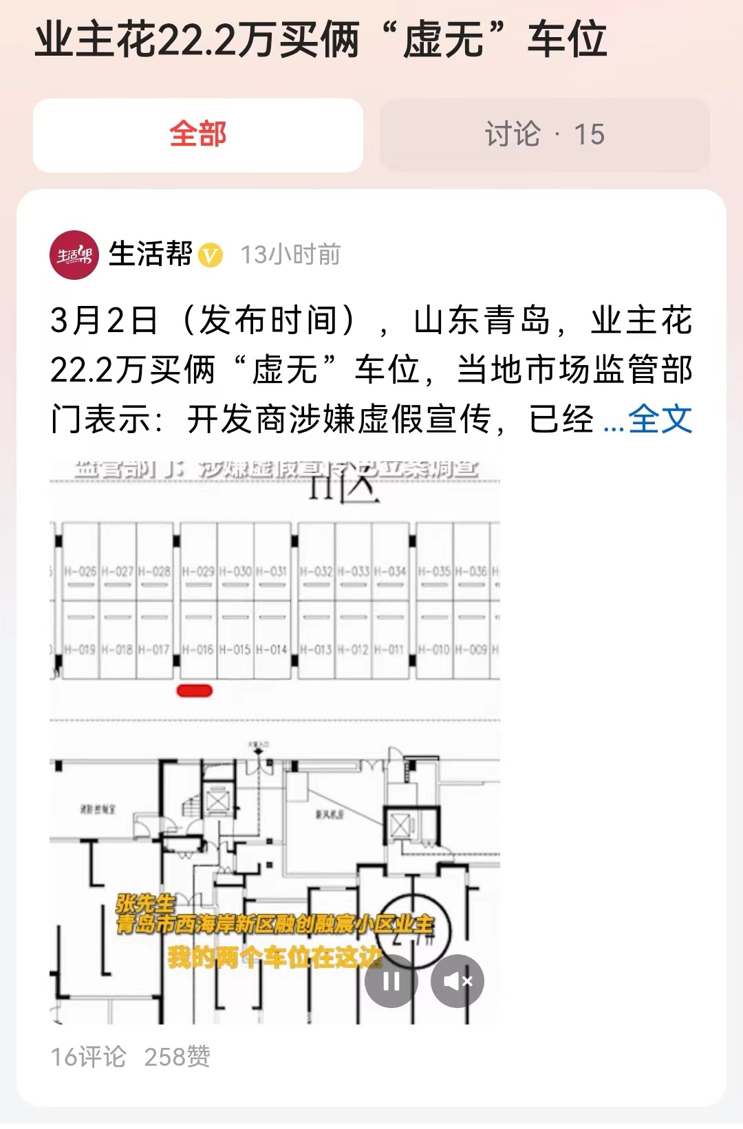 #业主花22.2万买俩“虚无”车位#业主还要等4个月之后立案的定型调查才结束,然后才能开启索赔之路。想一想这一点,是不是觉得购房的业主实在是太弱势了,这么一个定性清晰,事实明显的虚假宣传的事件,为什么不能让业主得到强制性的赔偿和保护呢?