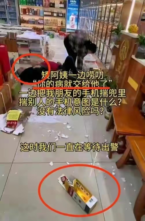 游客之前已经及时报了110,没想到最终过了35分钟警察才来。看到警察到来,老板和店里的阿姨双双躺在地上,造成互殴的假象。在这个过程中,他们已经将这两瓶酒抢了过去,并且砸碎了。同时将外包装上的条码全部撕掉,将茅台酒上的盖子和其他关键信息也全部扔掉。#买茅台的那些事# #抢茅台的日子#