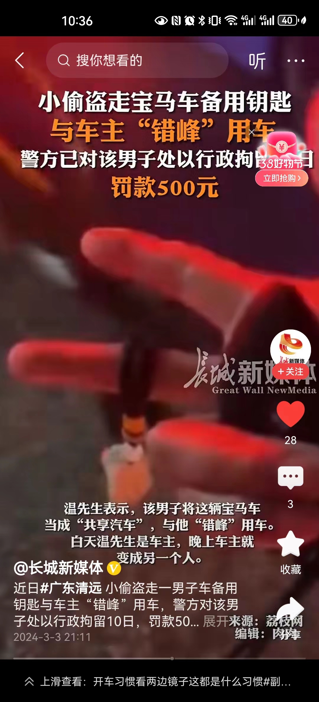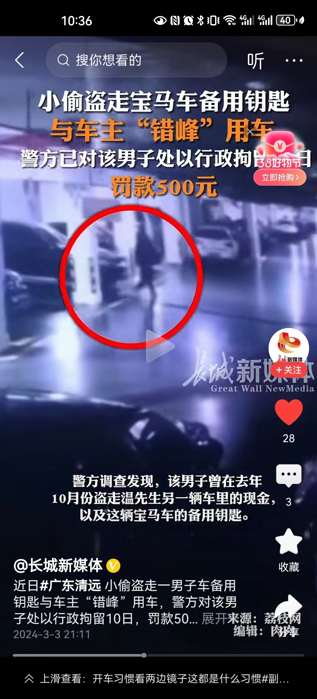 #男子偷走备用钥匙 与车主错峰用车#警方仅仅对于偷车人,处以拘留10天罚款500元的处罚,不知道车主觉得这样的处罚轻还是重,但有可能偷车人已经触犯了刑法,盗窃罪应该是有涉嫌的。