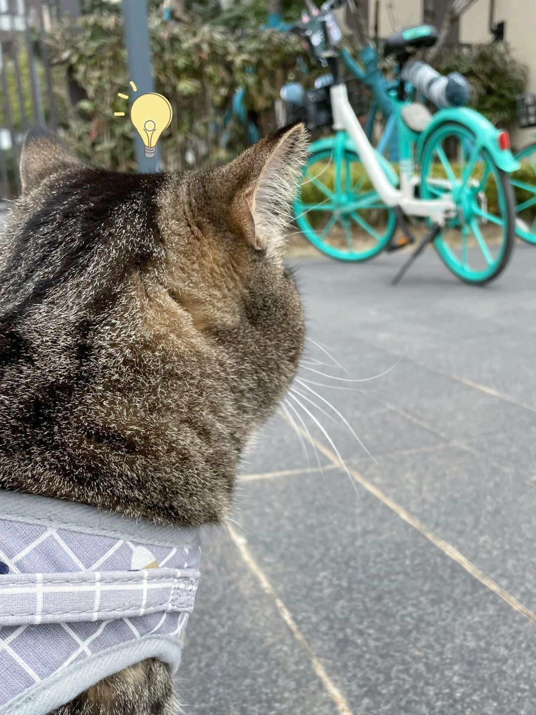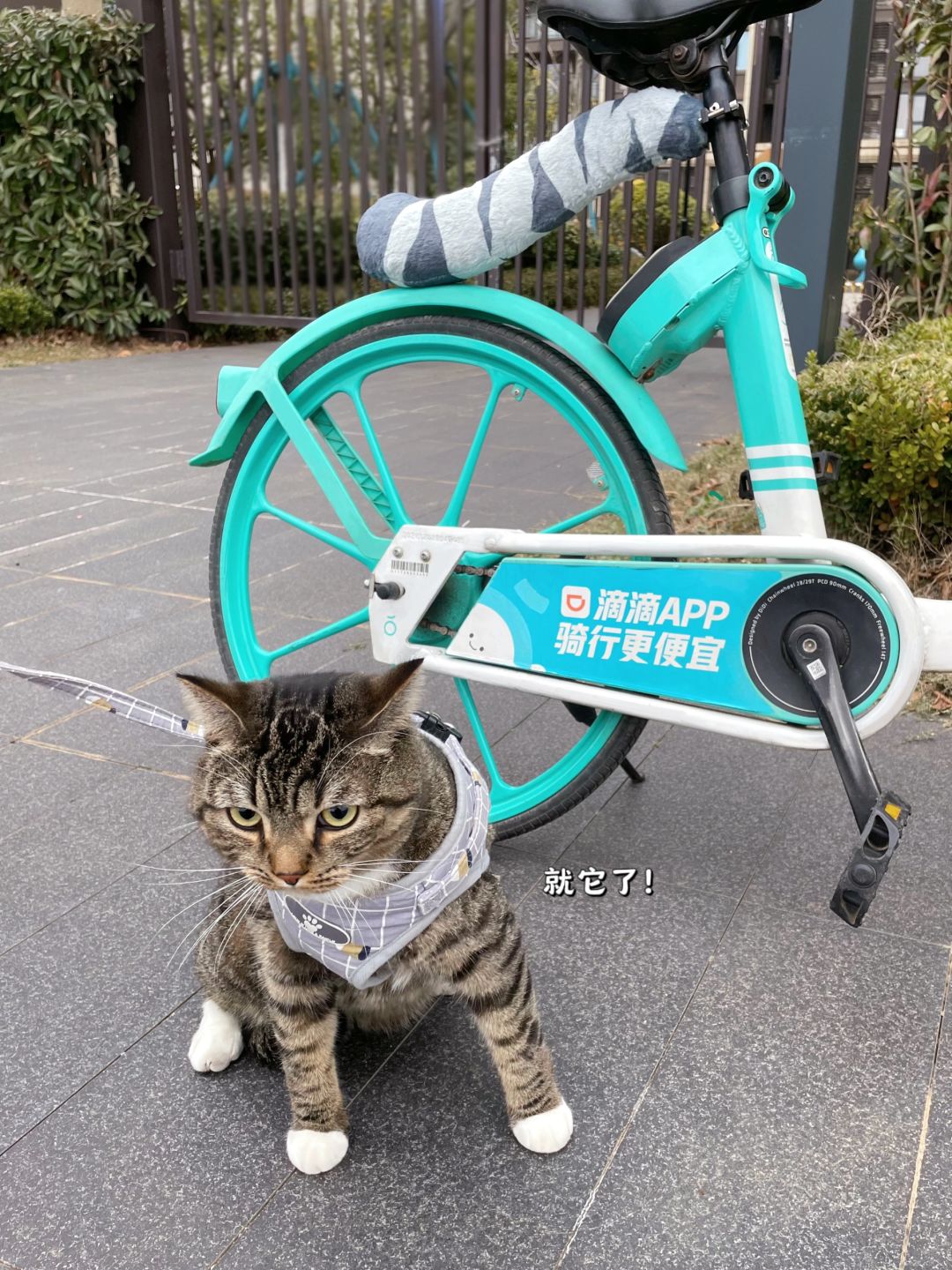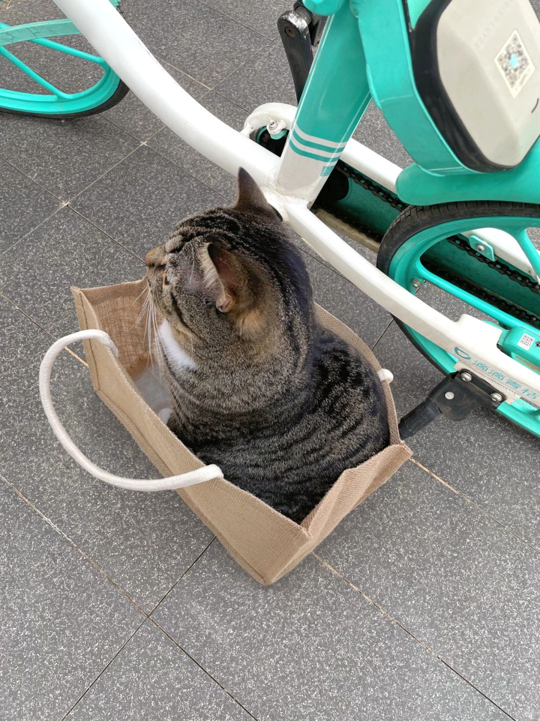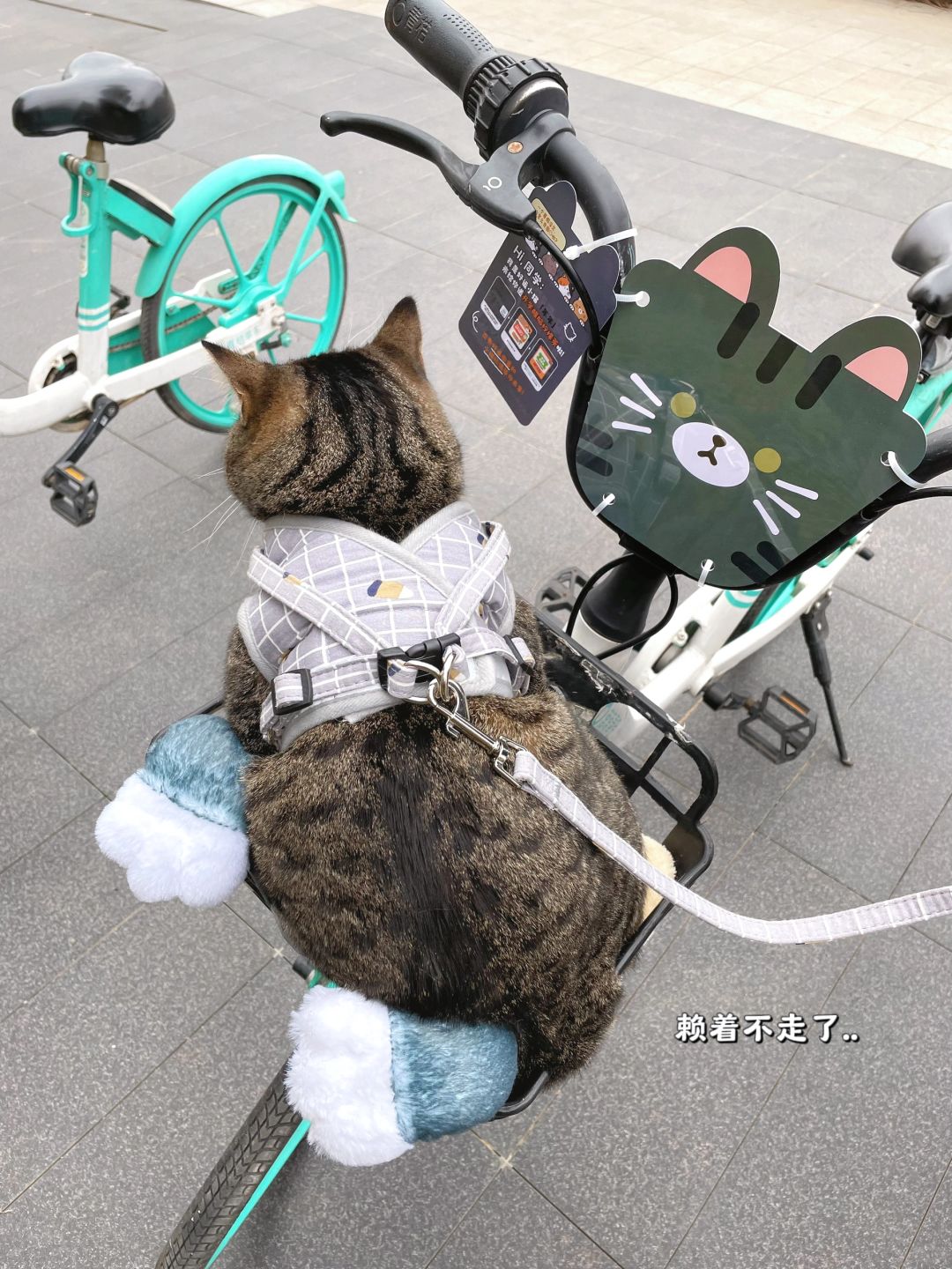 不是,现在共享单车都这么时髦了吗?饼饼看到这辆青桔眼睛都直了,爬到车筐里就赖着了,还一个劲儿蹭这个猫咪板子[拥抱R]。我好像明白了,饼子是想让我骑车载它去找猫猫朋友~