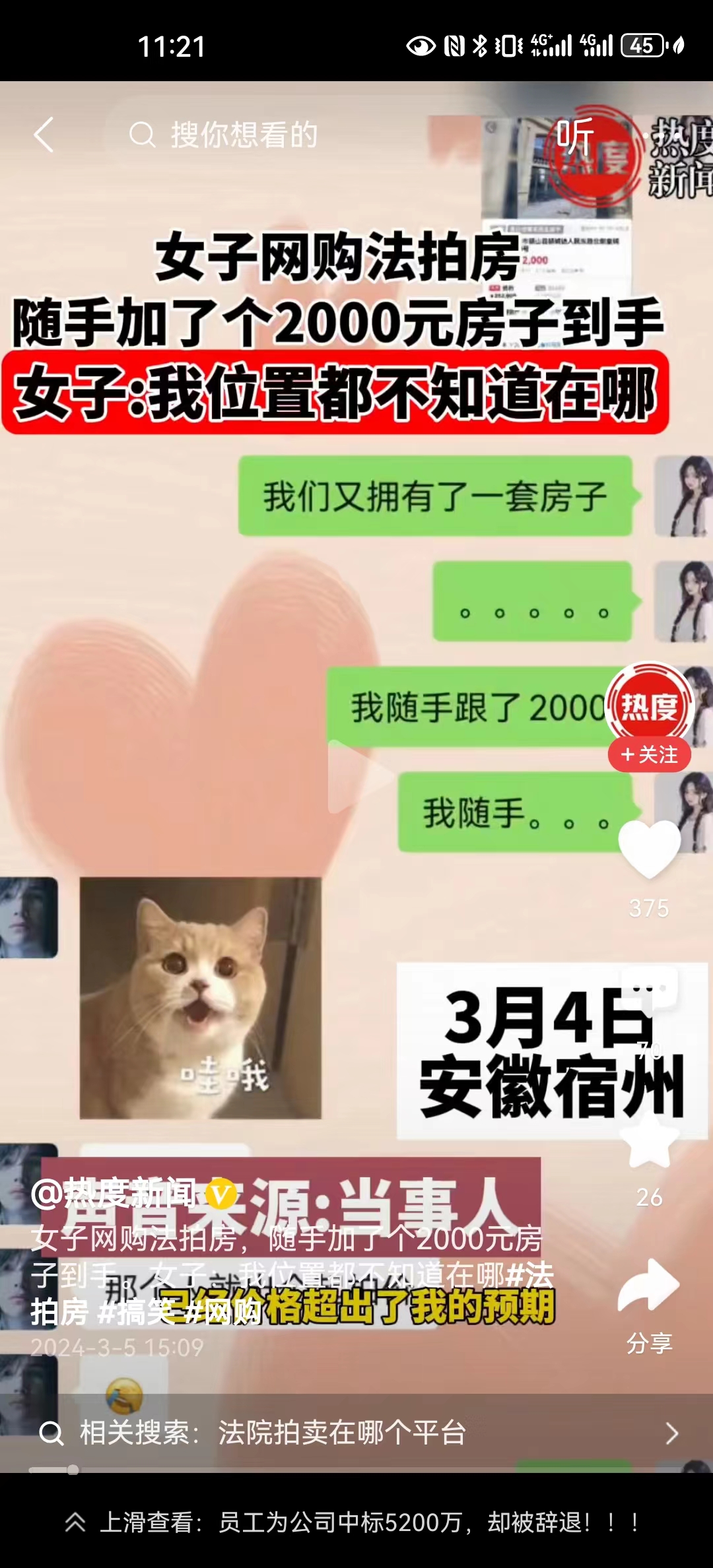 #女子网购法拍房 随手加了2000到手#不做事先的调查,盲目参加法拍房,看起来总的房价好像挺便宜,但有可能真的是进入了一个无法逃脱的陷阱。如果能够成功收到房也就罢了,如果收不到房,可能后续还要打官司,频繁的跑法院,那真是赔了钱又折时间。