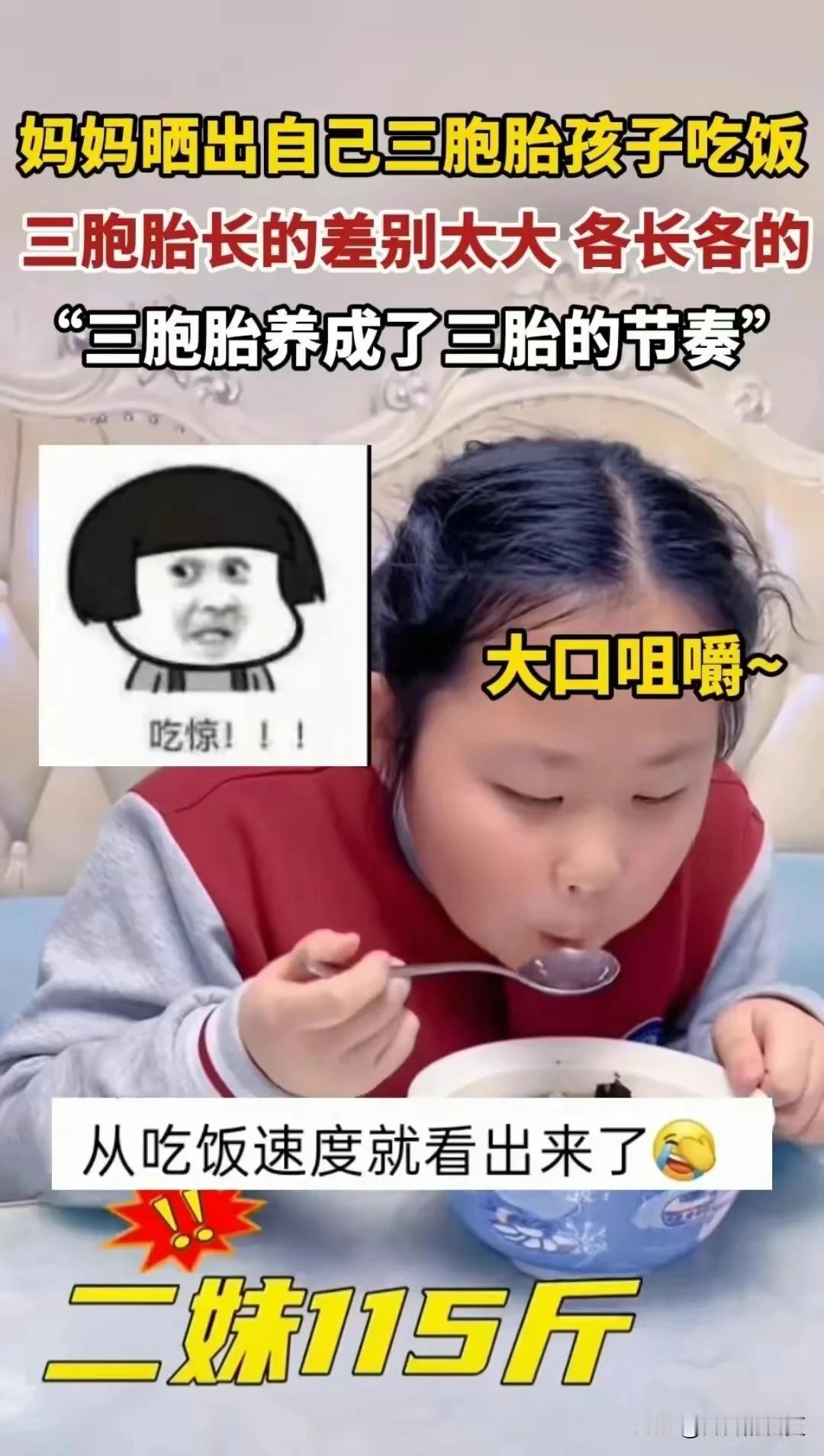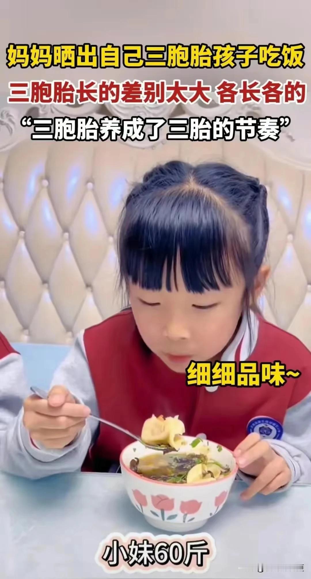 哈哈哈哈,我笑不活了,这哪是三胞胎,分明是大,中,小号。谁要说三胞胎,我和他急。3月6日,有博主发视频晒出自己“三胞胎”吃饭的视频称,开始怀疑自己做饭的水平了!明明是同样的饭菜,三个孩子却吃出来三种不同的感觉! 这三胞胎真的养出三胎的节奏。 大哥53斤,二妹115斤,三妹60斤。 二妹长了两个大哥的体重。 我都怀疑这妈妈是不是偏心了。 对女儿是投喂的方式,太好了,所以太胖。 对儿子放养,所以如此瘦弱。 网友说的好:一个横着长,一个竖着长,一个横竖都不长。 二妹妹成功的干翻了哥哥和姐姐。 老大叫老二,等于老三。 在这位妈妈精心呵护下三个孩子,不仅长得不一样,而且展现了各自的个性和才华。 三胞胎妈妈不容易,养大这三个娃,一定是很辛苦。 今天,三八妇女节。 祝这三胞胎妈妈妇女节快乐! 祝头条号上的姐妹们,妇女节快乐! 姐妹们都要今年20明年18岁的节奏![玫瑰]