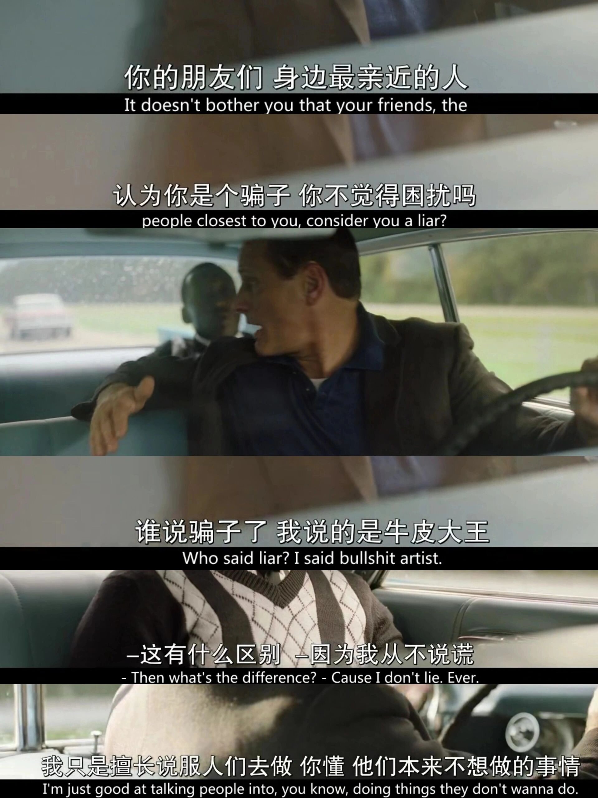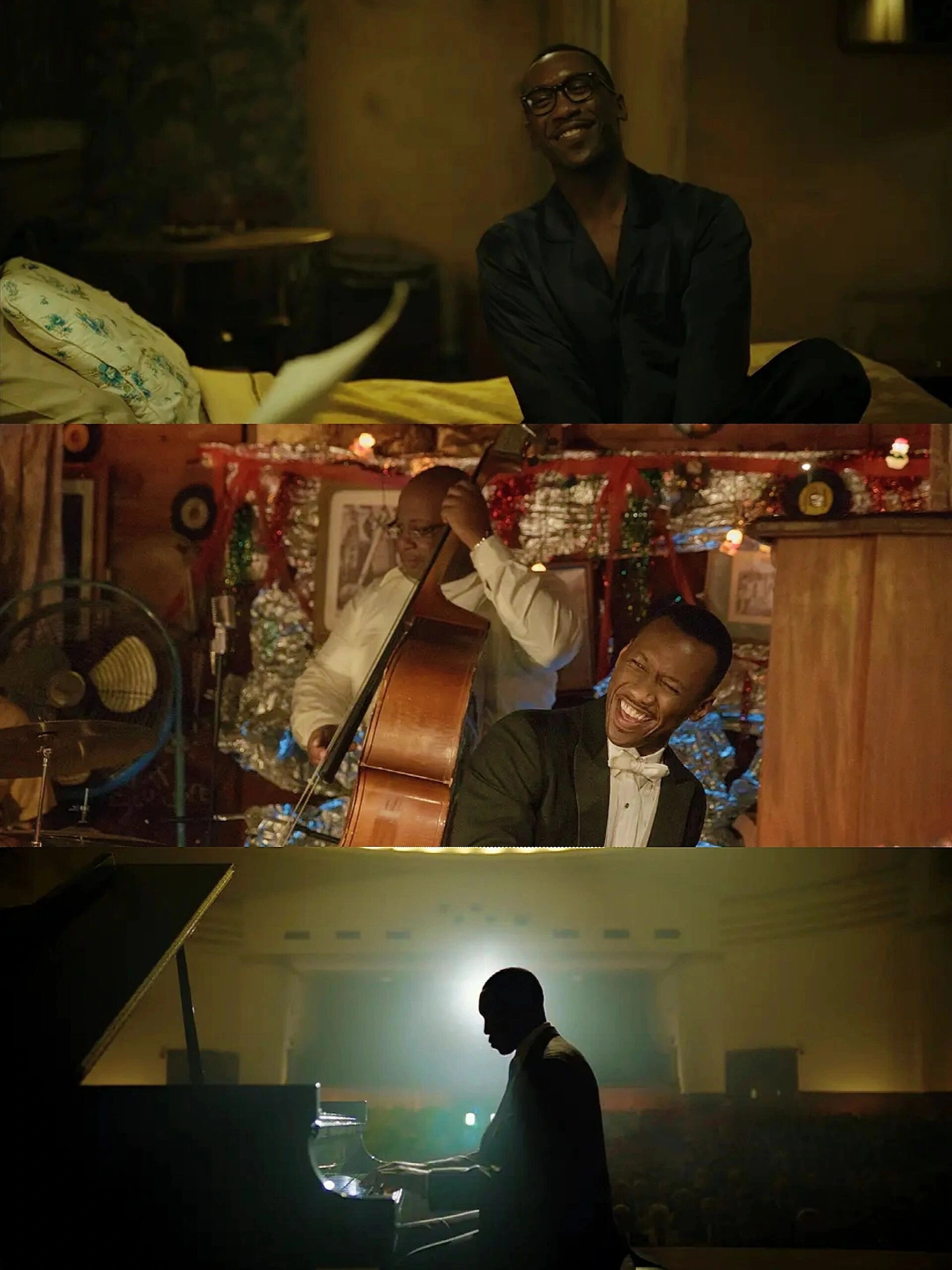 这一段尤其触动我:当唐在雨夜中,在车灯前,爆发着对托尼嘶吼着:’如果我不够黑,不够白,不够男人,那么告诉我,我到底是谁?’”时,我突然看到了唐找不到任何属于自己的团体的孤独感,大到种族,小到性别。实在太无力了……