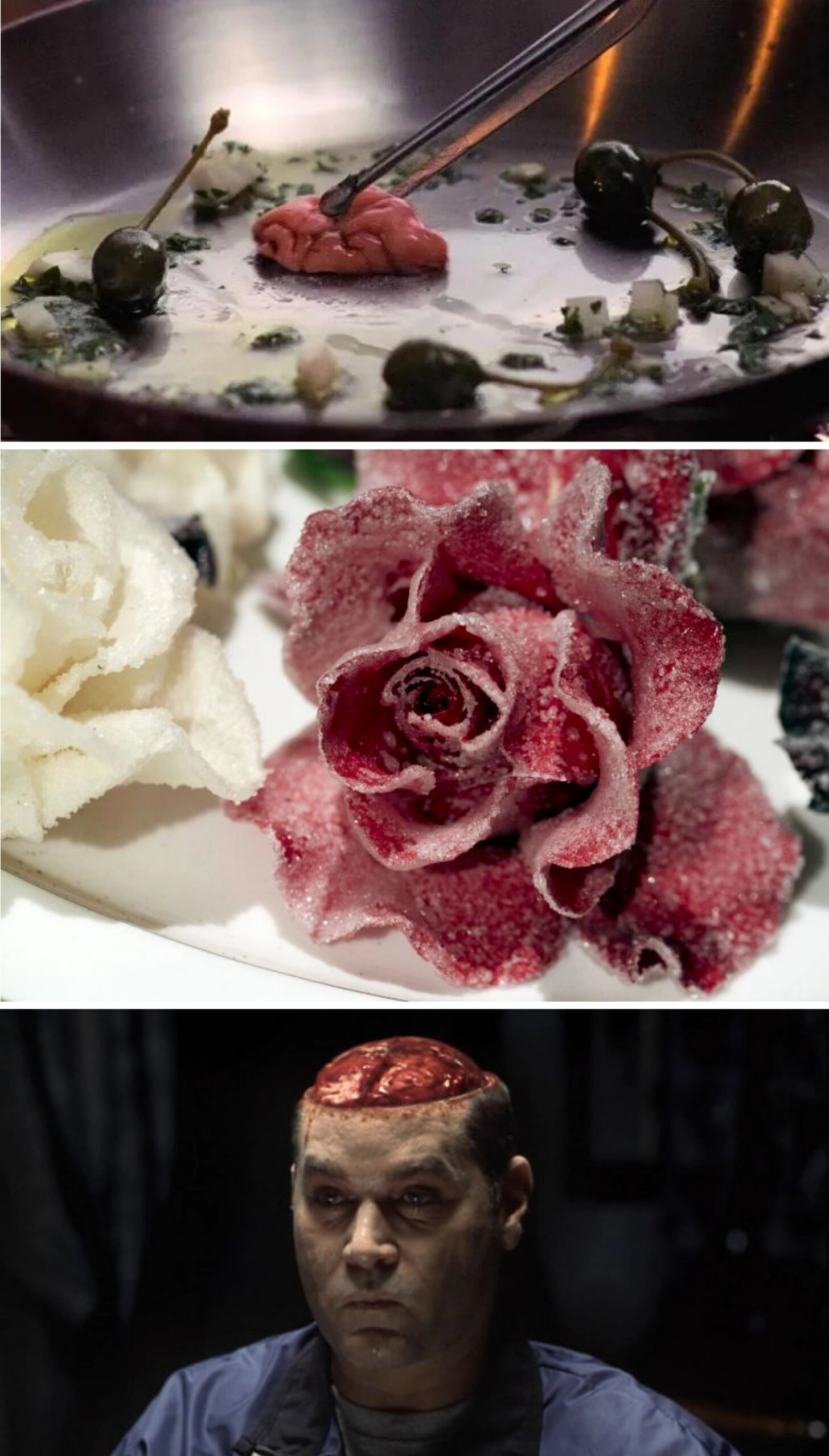 不得不提的是,有个片段让人印象深刻。在电影最后,有一个汉尼拔生吃人脑的画面,clarie就坐在他的正对面,汉尼拔把那个人的脑壳打开,切开了他的脑袋,并且吃了。这一段真的是超级的重口味!clarie 感觉很反胃,根本不能接受。拿起刀想要刺杀汉尼拔,却被汉尼拔反手拿掉,同时亲了clarie 。clarie却把汉尼拔的手铐住了,最后汉尼拔却砍了自己的手,同时他也说了句That's my girl ,这才是我的女孩。