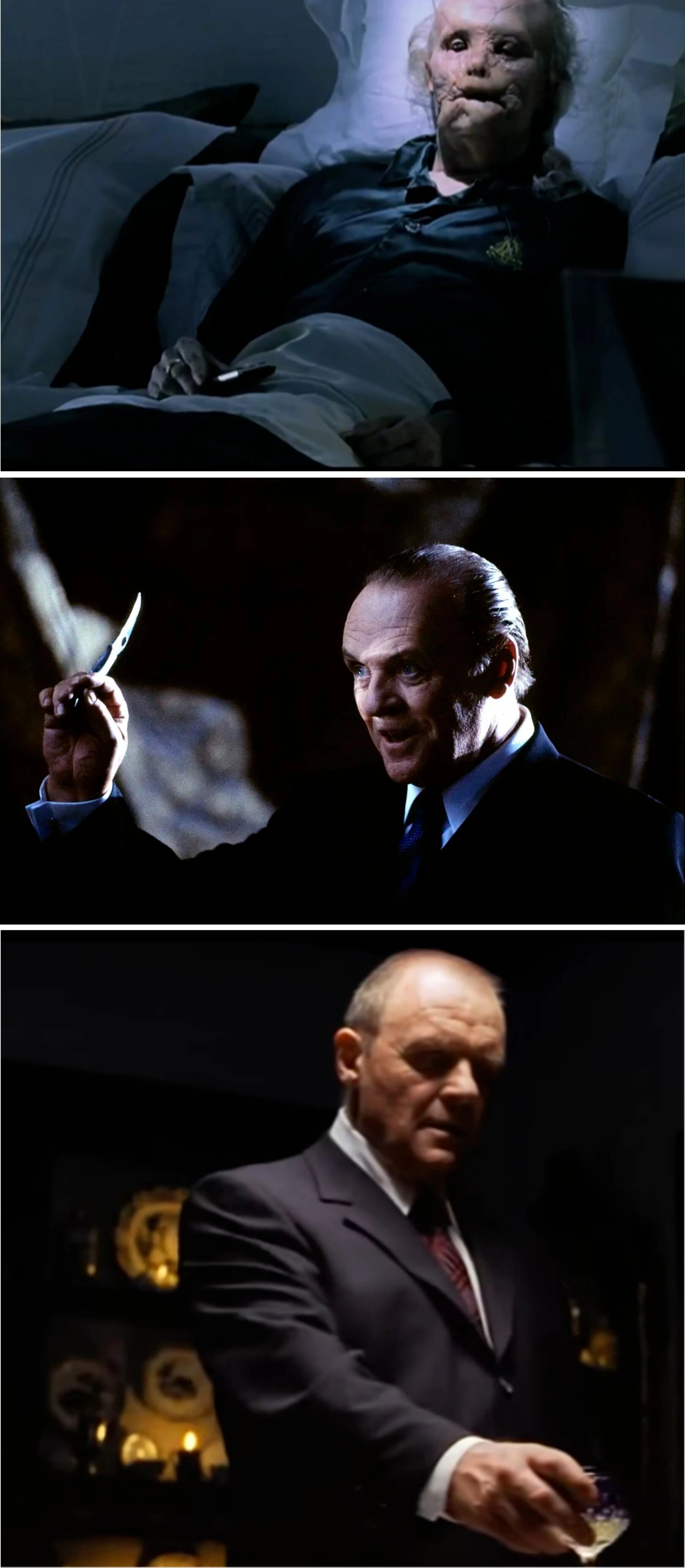同《沉默的羔羊》相比,《汉尼拔》的重点并不在于悬疑本身,而是在于史达琳和汉尼拔之间的感情线。影片不论从画面构图、镜头运用,还是色彩展现都是经典之作。影片结尾将情绪的积累达到高潮,优雅而疯魔的表演,不仅让人毛骨悚然,更让观众的心理防线被来回破防。