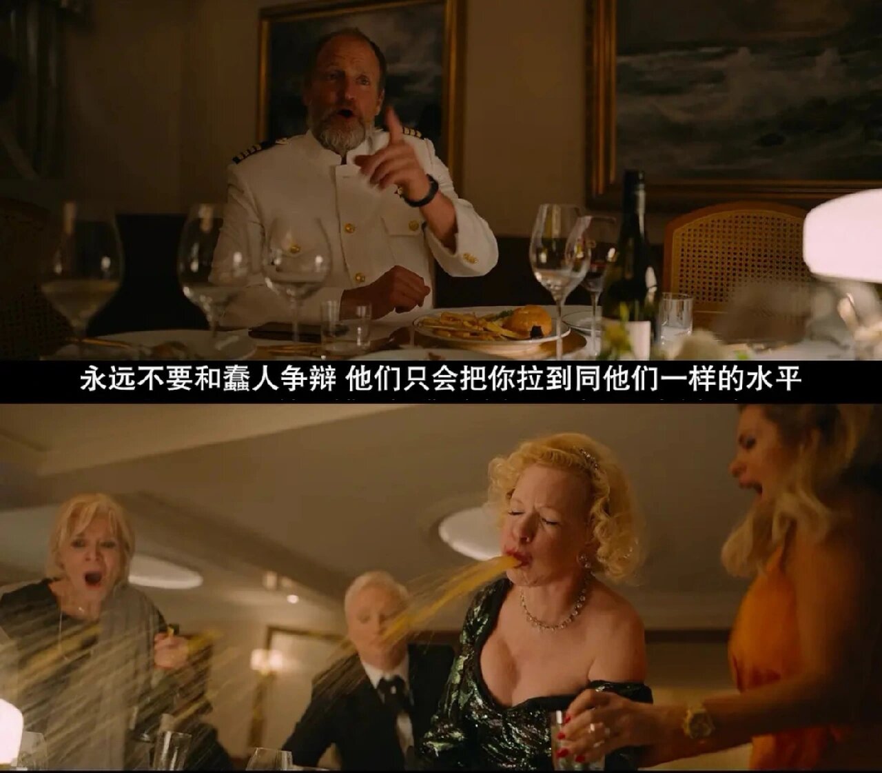 当金钱失去了作用,生存技能反而成为硬通货,而和现代社会获得金钱来源的复杂途径不一样。生存技能,相对平等。动物的原始需求才是最重要的,导演鲁本.奥斯特伦德真是热衷寓言故事,用三种完全不同的角度,解构了“人人平等”是多么可笑,却又是多么可行。