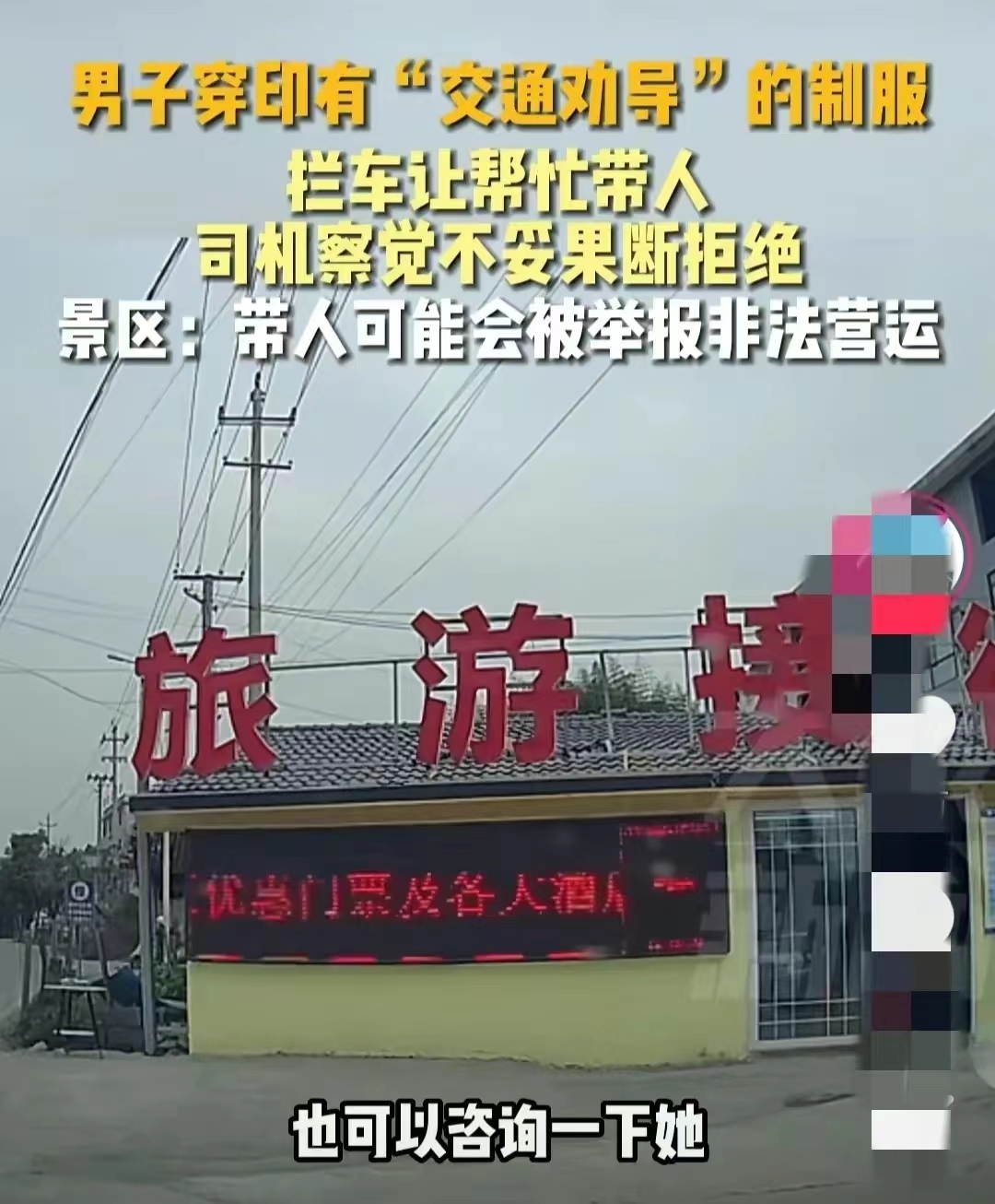 在3月9日,一位自驾车主就披露了这么一个视频和对话。一名穿着“交通疏导”马甲的男子,拦下一辆轿车,号称想送一位女孩到前面的景区,希望车主好心帮着捎带一下。车主觉得男子虽然穿着制服,但并没有佩戴任何官方标识或证件,看起来非常可疑,于是果断拒绝了。男子还反复在纠缠,车主离开之后打电话给景区,询问这事儿是不是真的?