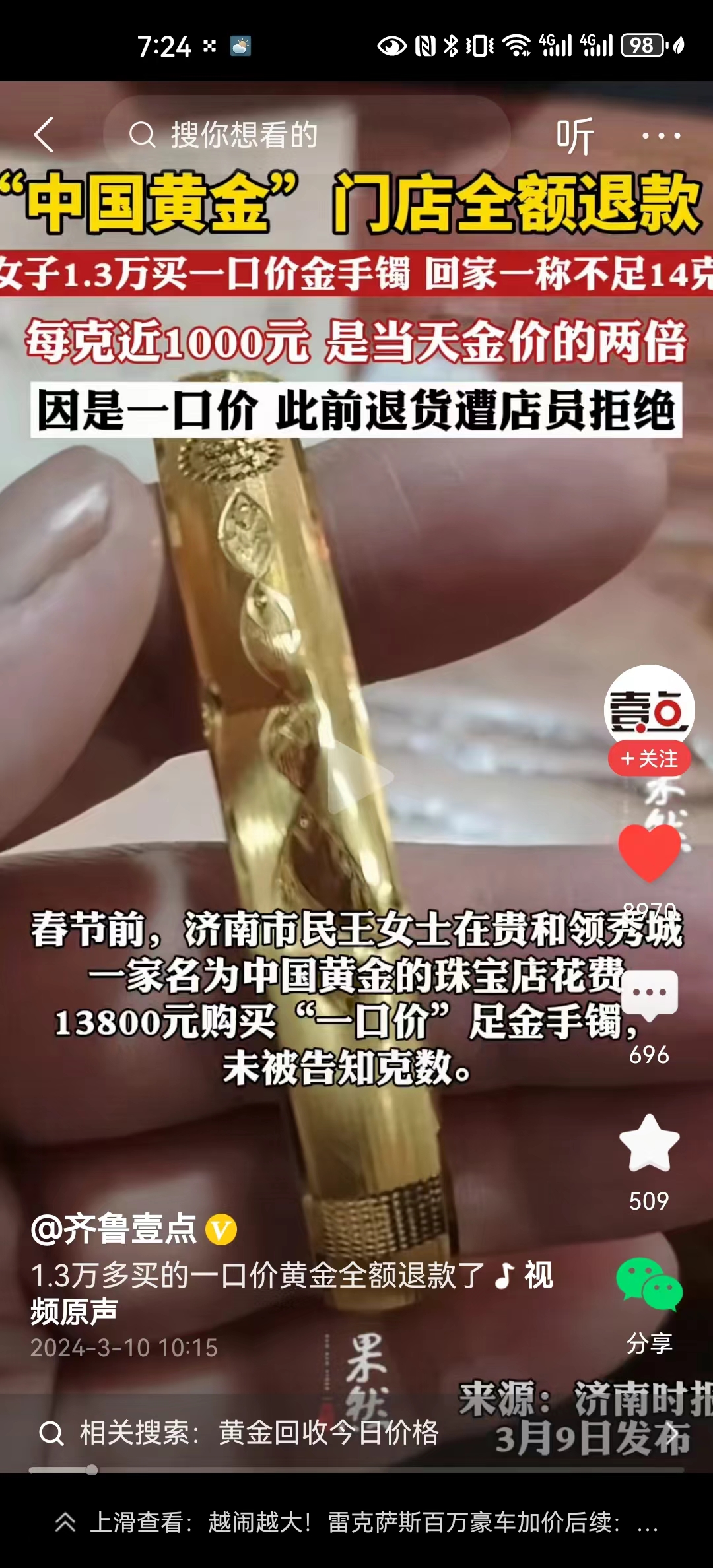 但是山东济南这位消费者碰到的这家金店,他的做法可一点不规范。他只标注了一个总的价格,没有标明黄金克数,这也是导致最终在工商部门的协调下全额退款的重要原因。另外一口价的硬金产品应该来说质量要过关,但是他们所做的这个金手镯出现了变形扭曲,其实它的中间是空的,那么也就是说也出现了质量问题,自然也需要退货了。