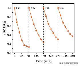 BWO复合材料的光催化活性的研究现状 本文通过简单的水热方法合成了g-C3N4/mBWO-2超薄纳米片,探究了不同质量比g-C3N4/mBWO-2复合材料的光催化活性。 研究了初始溶液pH值、催化剂用量和初始磺胺嘧啶浓度以及无机阴离子对降解效率的影响,并评估了催化剂的稳定性和重复利用性,系统地表征观察光催化剂的微观形貌、元素组成和晶体结构。 本实验中所有用于g-C3N4/mBWO-2材料制备、光电性能测试及光催化性能测试的试剂均为分析纯,并且未经过进一步纯化。 这些试剂主要包括三聚氰胺、氯化铵、五水硝酸铋、二水钨酸钠、十六烷基三甲基溴化铵、磺胺嘧啶、蒸馏水、无水乙醇、无水硫酸钠、氯化钠、硝酸钠、盐酸、氢氧化钠等。 所用实验仪器包括精密天平、电子天平、马弗炉、陶瓷坩埚、磁力搅拌器、电热鼓风干燥箱、聚四氟乙烯反应釜、高速离心机、氙灯、紫外-可见分光光度计、电化学工作站等。 氮化碳(CNNs)的制备:将2g三聚氰胺与10gNH4Cl充分混合作为膨化剂,在马弗炉中550℃加热4h,升温速率为5℃min-1,自然降温得到g-C3N4,然后,将g-C3N4充分研磨成细粉。 将细粉(2g)与NH4Cl(10g)混合,在密封氧化铝坩埚中500℃加热2h,升温速率5℃min-1,研磨得到CNNs。 CNNs/mBWO-2复合材料的制备:在80mL去离子水中加入一定量的CNNs、50mg十六烷基三甲基溴化铵(CTAB)、1mmolNa2WO4·2H2O和2.5mmolBi(NO3)3·5H2O。 搅拌30min后,将混合溶液转移到100mL内衬特氟隆的高压釜中,高压釜在120℃下处理24h。 最后,收集产物分别经去离子水和无水乙醇洗涤多次直至没有泡沫后,在60℃的空气中干燥10h,研磨得到CNNs/mBWO-2复合材料。 制备0.5:1、0.7:1、0.8:1不同质量比的CNNs/mBWO-2并分别标记为50%CNNs/mBWO-2、70%CNNs/m-BWO-2、80%CNNs/m-BWO-2。 本研究通过X射线衍射能谱测定了CNNs、mBWO-2和70%CNNs/mBWO-2的衍射峰位置,结果如图4-2所示。 在12.9°和27.6°两处有明显的g-C3N4特征峰,分别与g-C3N4的(100)和(002)晶面相匹配[117,118]。 其中XRD最强峰(002)在27.6°处的峰是由于层间周期性叠加而产生,表示的材料的二维堆叠情况。 一般来说块状g-C3N4(002)峰值在27.3°左右,即与块状g-C3N4相比CNNs移至27.6°表明g-C3N4层间的距离减小了,说明三聚氰胺在和NH4Cl混合物的热处理过程中形成了二维g-C3N4纳米片[119]。 然而,CNNs的峰没有出现在70%CNNs/mBWO-2的XRD谱图中,主要原因是CNNs的结晶度较低,而且CNNs与70%CNNs/mBWO-2在28.30°处的主峰有重叠,导致样品中无法检测到CNNs的特征峰,该结论与一些文献一致。 这些结果表明,负载CNNs后没有改变原有的晶体形态,并且没有观察到其他的杂质峰,说明样品均没有引入其他杂质,且纯度较高,表明材料的成功制备。 在模拟太阳光照射下70%CNNs/mBWO-2在90min内可达到86.98%的磺胺嘧啶降解率,相应的速率常数(k)为0.0242min-1。 此外,经过四次循环实验后,降解效率有一定的下降,说明所制备的材料具有良好重复使用性和光催化稳定性。 电化学实验、UV-visDRS、PL以及TR-PL表明其良好的光催化降解效率归因于CNNs/mBWO-2异质结的构建扩大了光响应范围并促进了电子和空穴的迁移。 本章通过XRD、XPS、TEM、UV-visDRS分析和光电化学等表征手段对所制备材料的物理化学性质进行了研究。 此外,还研究了不同Bi/W的摩尔比、溶液初始pH值,催化剂投加量、以及磺胺嘧啶初始浓度和不同种类阴离子对光降解活性的影响,在优化的条件下,mBWO-2可以达到80.75%的磺胺嘧啶降解,相应的速率常数(k)为0.0179min-1。 该催化剂在四次循环试实验后的光催化降解活性有明显的下降,说明催化剂稳定性和循环使用性一般。