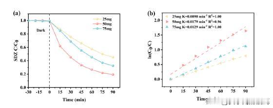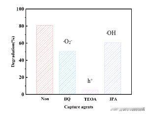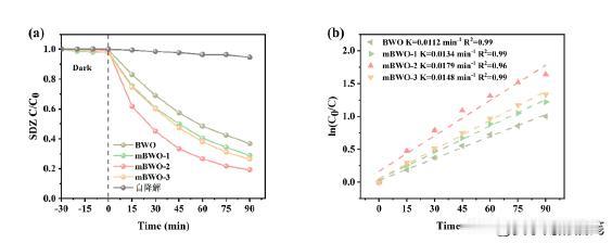 无机阴离子对光催化降解的促进作用研究 不同浓度的无机阴离子对光催化降解有着促进或者抑制的作用,因此研究共存离子影响光催化降解磺胺嘧啶是十分必要的。 本实验选取了实际水体中广泛存在的几种离子(Cl-、SO42-、NO3-)进行研究,研究共存离子种类以及浓度对光催化降解抗生素的影响,实验结果如图3-11所示。 通过在模拟太阳光(AM1.5)照射下光催化降解磺胺嘧啶溶液来评估所制备的催化剂的光催化性能。 如图3-7(a)所示,在黑暗条件下,加入BWO,mBWOx(x=1、2、3)对磺胺嘧啶进行吸附,30min后四种材料对目标污染物几乎没有吸附效果,吸附率均在1%左右。 为了研究光催化材料的降解效率和磺胺嘧啶的光稳定性,进行了磺胺嘧啶自降解实验。 没有投加光催化剂光照90min的情况下,观察到磺胺嘧啶降解了5.36%,磺胺嘧啶的浓度没有发生明显的变化,说明磺胺嘧啶在可见光下具有一定的稳定性。 在投加块状光催化剂BWO并光照90min后磺胺嘧啶降解了63.20%,降解速率为0.0112min-1。 可以看出BWO明显提高了磺胺嘧啶光催化降解效率,光催化效率的提高得益于BWO较正的价带位置,价带位置越正,光催化剂的氧化能力越强。 在合成BWO的条件下加入50mgCTAB成功合成了具有超薄结构的mBWO-1,从3-7(a)中可以看出在相同的降解条件下mBWO-1的降解效率较BWO有了一定的提升,降解效率为71.16%,降解速率为0.0134min-1。 在合成具有超薄结构的Bi2WO6的条件下,本研究调整了Bi/W的投加比例(2.5:1、3.0:1),发现适当提升Bi/W比均能提高磺胺嘧啶的降解效率,当Bi/W为2.5:1时即mBWO-2的降解效率提升最大,降解效率为80.75%,降解速率为0.0179min-1是BWO的1.59倍。 此外,本实验设置了三组不同的催化剂投加量(25mg、50mg、75mg)来分析mBWO-2材料对降解磺胺嘧啶的影响。 光催化降解实验在磺胺嘧啶浓度为20mg·L-1,溶液pH=9的条件下进行。 结果如图3-7所示,当mBWO-2投加量为25mg,在90min光照下磺胺嘧啶的去除率为55.01%,降解速率为0.0090min-1。 当mBWO-2催化剂的用量从25mg逐渐增加到75mg时,材料对磺胺嘧啶的降解效率呈现出先增加后降低的趋势,当mBWO-2催化剂投加量为50mg(0.50g·L-1)时,磺胺嘧啶达到最高降解效率约80.75%。 因此0.50g·L-1是最佳催化剂用量。 当mBWO-2投加量较少时,在相同条件下由于反应溶液中缺少活性中心,导致光的利用率变低,产生的光生电子和空穴变少,磺胺嘧啶不能被完全降解。 当mBWO-2投加量过多时,反应溶液中虽然有更多的活性位点,但过多的催化剂会增大反应溶液的浊度,导致透光率变低甚至能屏蔽光,从而限制光催化降解反应[109-111]。 因此,为了最大程度地利用活性组分和光能,0.5g·L-1的mBWO-2为实验体系的最佳投加量。 本实验以mBWO-2为研究对象,在抗生素初始浓度为20mg·L-1、催化剂投加量为0.5g·L-1的条件下,通过1mol·L-1HCl和1mol·L-1NaOH调节磺胺嘧啶溶液的初始pH值分别为3、5、7、9和11来研究磺胺嘧啶溶液初始pH值对光催化效率的影响。 值得注意的是,在光照30min时不同浓度下磺胺嘧啶的降解效率为75.95%(5mg·L-1)>55.55%(10mg·L-1)>54.86%(20mg·L-1),在后60min的光照时间里初始浓度为5mg·L-1溶液降解效率只提升了6.88%,10mg·L-1、20mg·L-1溶液降解效率分别提升25.6%和25.89%。 合理推测在磺胺嘧啶降解的过程中产生了难降解的中间产物覆盖了光催化剂的表面活性位点,抑制了磺胺嘧啶的降解。 综上,结果表明,加入的CTAB可作为长链分子可以插入到[Bi-O-Bi]层之间,从而减少了堆积并诱导Bi2WO6形成超薄二维结构,超薄结构能通过减少光生载流子的迁移路径,来提高光生载流子的分离效率。 经过条件优化实验,我们发现可以通过调节Bi/W的摩尔比达到最优异的光降解效率且不同催化剂投加量、溶液的初始pH值、磺胺嘧啶初始浓度以及不同种类及浓度的无机阴离子均对磺胺嘧啶的降解有一定影响。