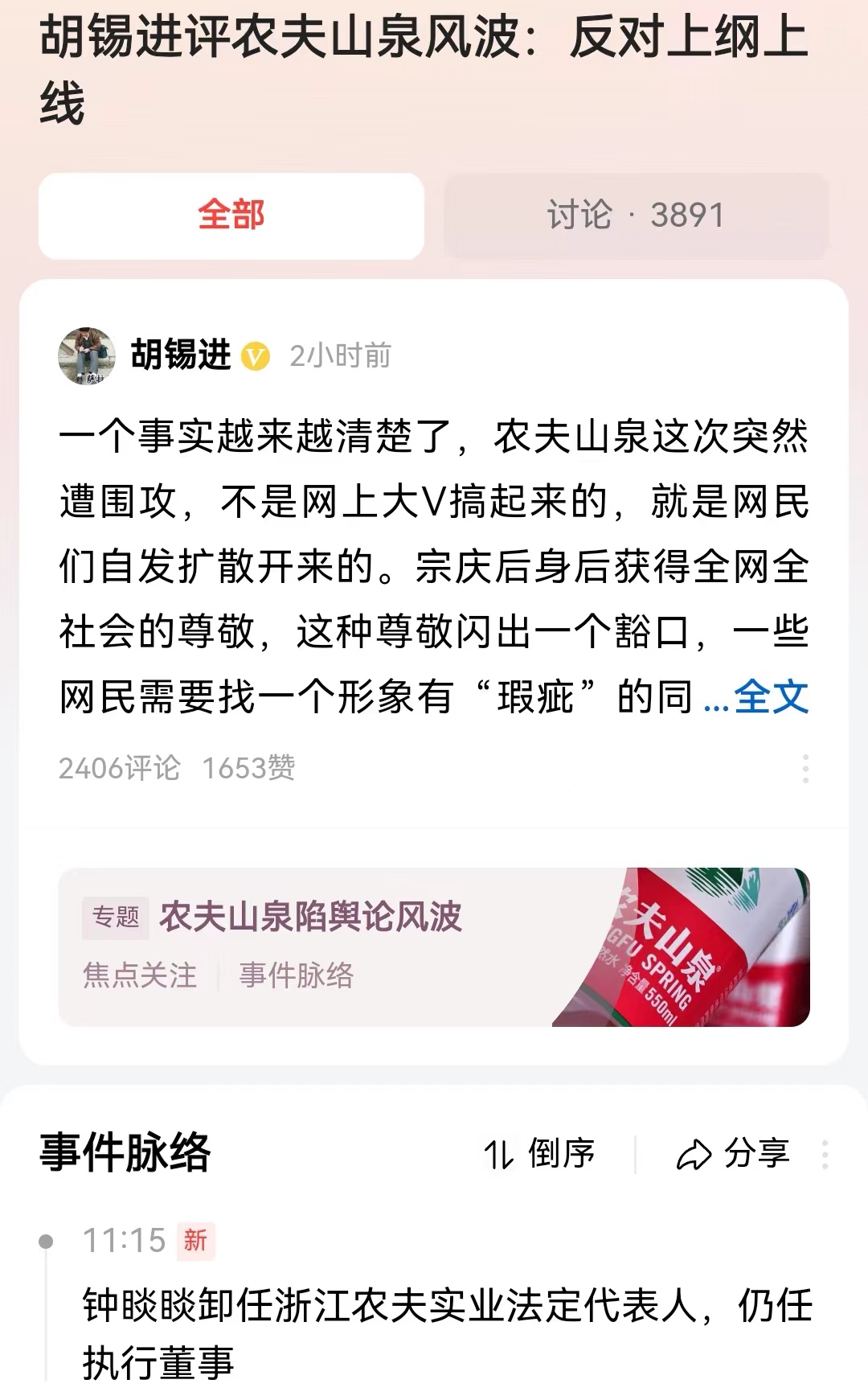 #胡锡进评农夫山泉风波:反对上纲上线#弃籍税可以讨论起来了!胡锡进老胡也说“钟家形象有个网上不喜欢的“瑕疵”,那就是钟睒睒的儿子钟墅子入了美国籍”。那么想一想将来从中国赚来的巨额财富,就通过这个安排,顺利的可以带走!这会不会是引发民众现在产生巨大风波的核心点呢?假如我们现在已经有了弃藉税,那么这场风波越演越烈吗?看问题要看到核心,看到重点。其实这次的重要会议上也有议案,讨论弃籍税。