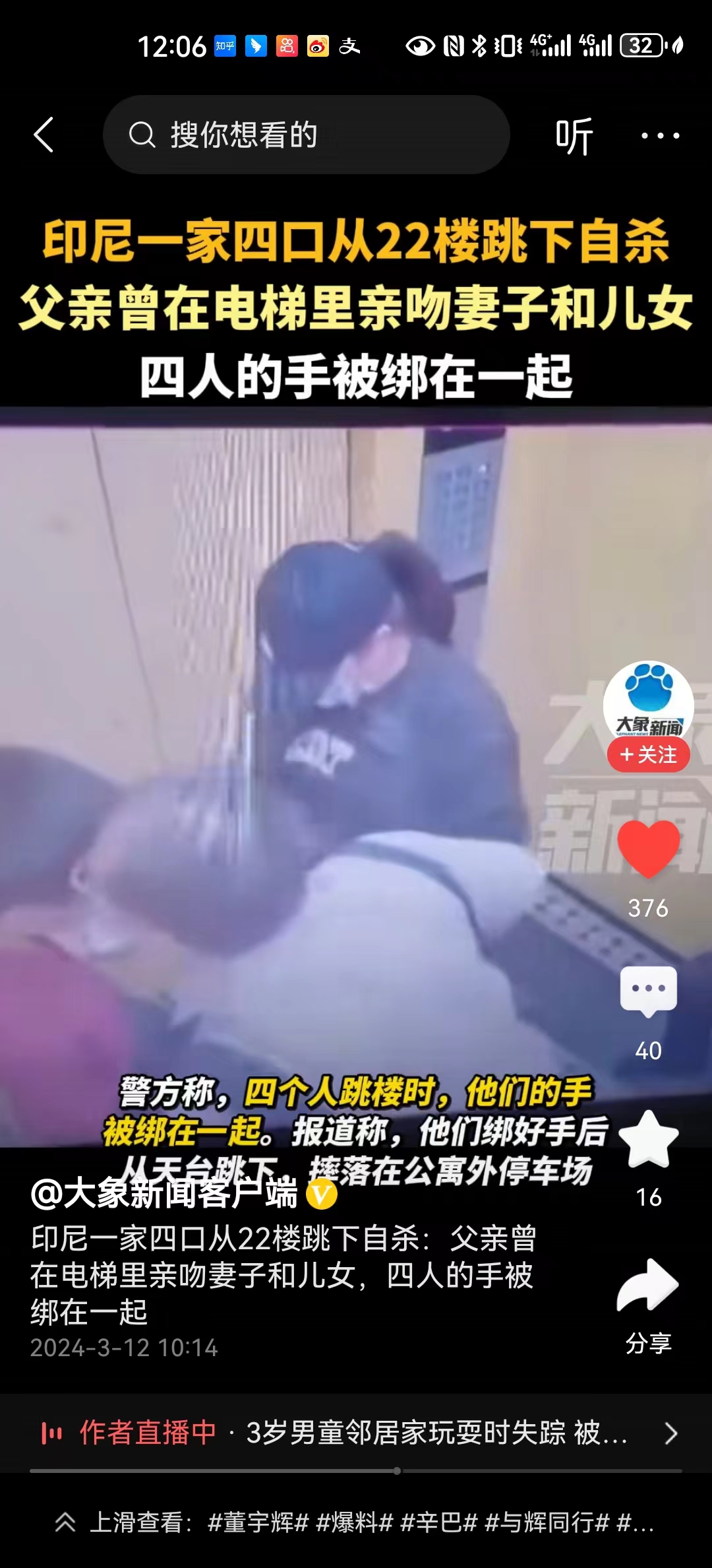 #印尼一家四口从22楼跳下自杀#真的好惨好惨!看到一家人在电梯中相互亲吻,内心真的有点受不了。此时这一家人已经知道他们要走向绝路,但是却如此从容。他们对这个世界是充满了满满的绝望啊?不知道他们的人生经历了什么样的困难无法过去,最后选择了齐齐赴死。