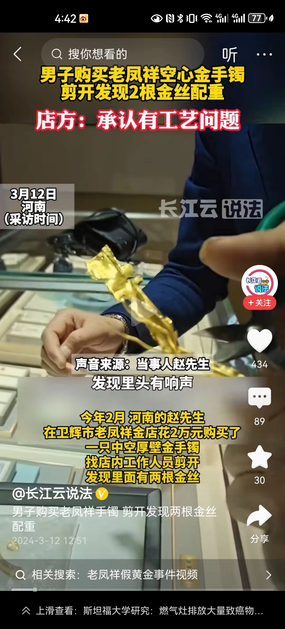 现在老凤祥品牌也承认里面塞了两根金丝,每一根长6厘米。其实这个金手镯就是一个质量问题。本身应该是没有的,但是可能工艺不达标,做出来的金手镯发现分量欠缺。就填补了金丝扔了进去。在一定程度上,这个金手镯就属于质量低劣的金饰。#老公我要买镯子#
