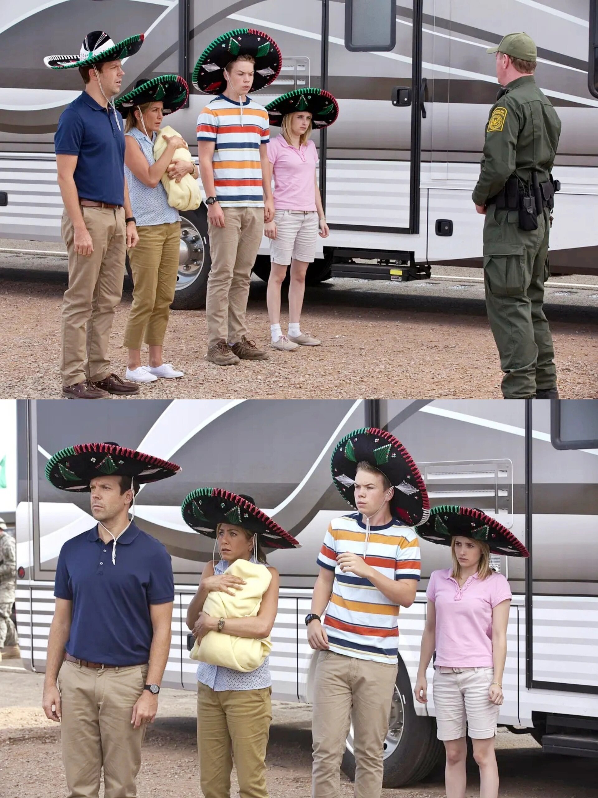 ⭐️为了掩人耳目,大卫想到了一个绝妙的计划,他找来脱Y舞娘Rose假扮妻子,流浪女孩Casey假扮女儿,Kenny假扮儿子,“一家人”开着房车直奔墨西哥,一路惊险!