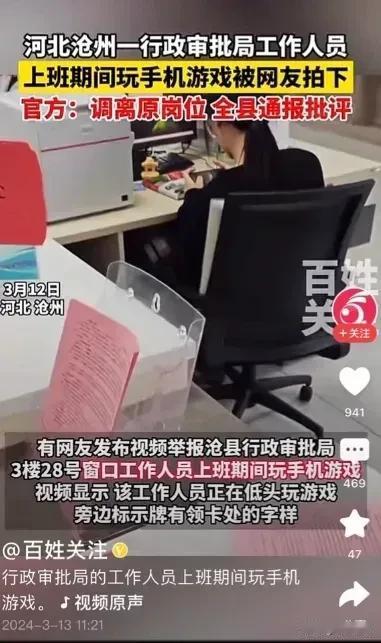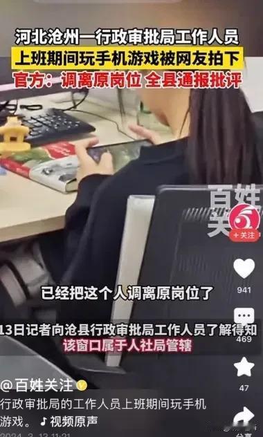 闹大了呀!女公职人员上班打游戏,被网友拍下并曝光,好好的一份工作,不知道珍惜,这被网友举报了,会不会后悔? 近日,一女子到河北沧州行政审批局办业务,发现里面的工作人员在打游戏。 打游戏就打游戏,有业务上门就赶紧热情招待,处理业务呀。 但工作人员的神操作,惊呆了很多网友。 公职人员不但没有给顾客办业务,而且还耍酷,把顾客的证件给甩飞了。 这可是令人接受不了的行为。 网友把这个视频一曝光,迅速引发了社会的广泛关注。 13日,当地人社局的工作人员表示,该工作人员是劳动局的辅助人员,已经专门开了专题会议,玩游戏肯定是不允许的。现在该工作人员已经调离原单位,全县通报批评。 看看现在的年轻人,一点点不珍惜自己的羽毛。 多么好的工作啊!不知道珍惜, 工作期间玩游戏,这是对工作的一种不负责任。 这种行为是个人的不作为。 看这女职员的行为,不是一天两天的打游戏啦。 因为有人爆料,所以她才下课。 如果没有人曝光,她还在单位里浑水摸鱼。 不知道是不是职能部门的官僚作风都这样子。 很多人都觉得自己的手里是铁饭碗,爱咋咋地,喜欢放飞自我。 这让我想起滥竽充数那个典故。 不知道这女公职人员,谁给她的勇气,让她在上班时间打游戏。