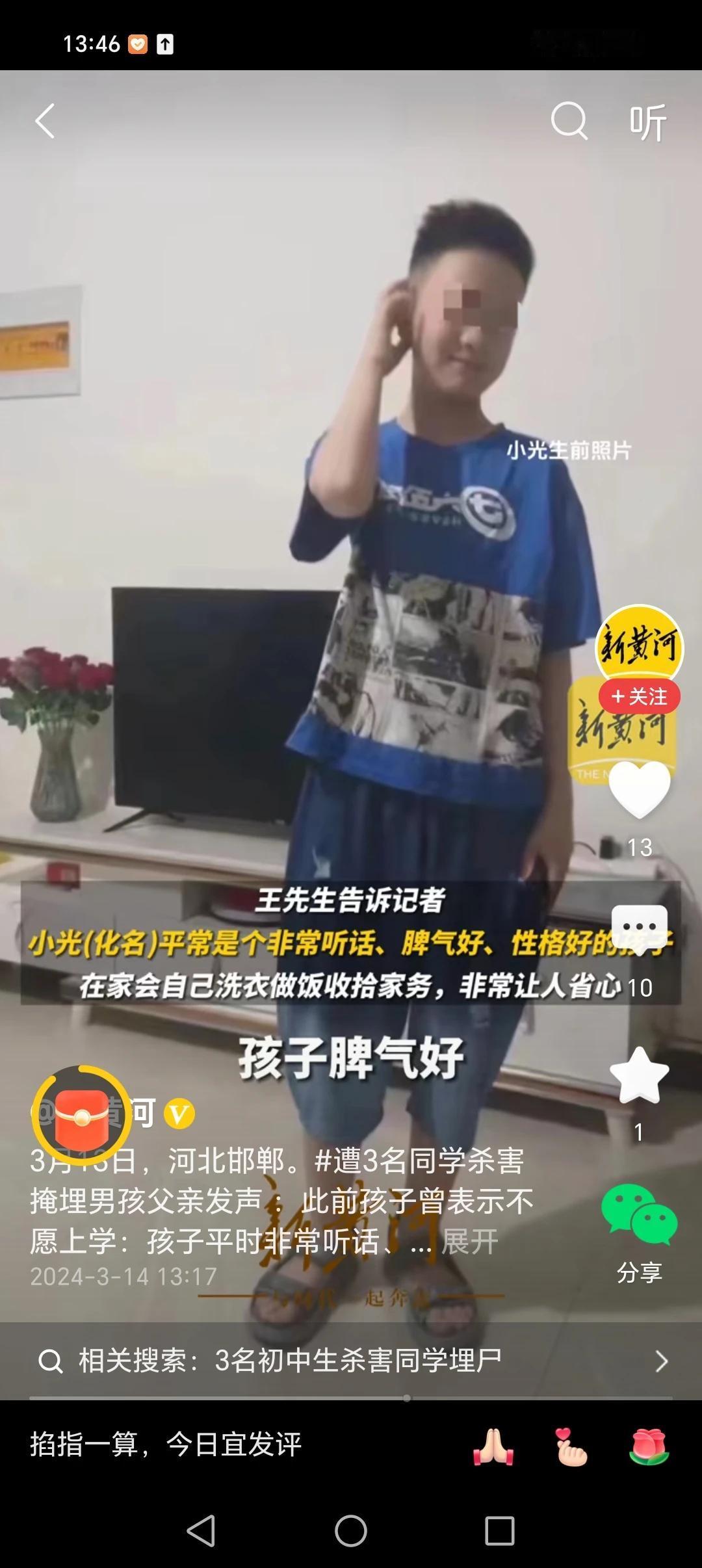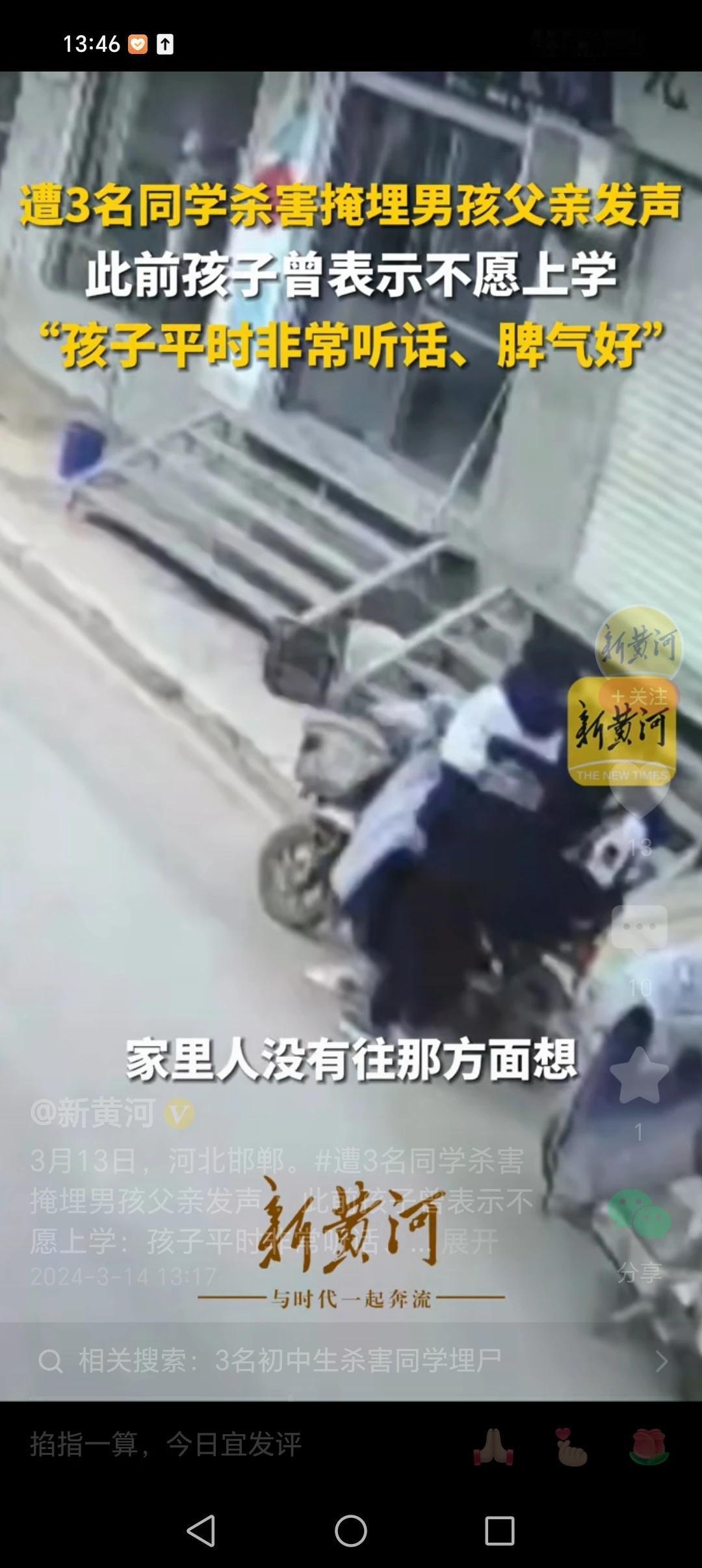 遭3名同学杀害掩埋的男孩父亲发声:此前孩子曾表示过不愿意上学,孩子平时非常听话,脾气也好,就是一直不想去学校。 从这名男孩子的父亲嘴里,我们知道,这个孩子是个听爸爸妈妈话的好孩子。 孩子不是个暴脾气,脾气好。 但唯一的缺点就是,孩子不愿意上学,不想去学校 。 孩子为什么不愿意去学校? 这是一个大问题。 这个家长对于孩子的不愿意去学校这个问题,家长没有过多的询问,他没有听听孩子的心里话。 这个家长很心大,他甚至都没有和班主任沟通一下。 最起码得知道,自己的孩子为什么突然不愿意上学? 问问班主任,孩子在学校里有没有其他情况? 有时候,还要问一问,孩子最要好的朋友,他比老师知道的还要多一些。 家长大多数都会觉得,孩子不愿意去学校,肯定是孩子本身自己的问题,他想逃学。 但很多家长都没有想到,孩子在学校里会受到同学们的欺负,霸凌。 这父亲说孩子听话脾气好。 我从这个父亲的话语里听出了下音:这孩子很老实,不调皮,没有弯弯绕绕的心眼子。 就是这样老实的孩子,学习又一般的孩子,容易受到某一些同学的欺负。 他们会让这老实孩子干这干那,买这买那,稍有反抗,就会联合其他同学揍他。 如果偶尔告老师,他们更加变本加厉。 有时候,同学们偶尔打架,老师也睁一只眼闭一只眼。 所以,当我们发现孩子有异常的时候,家长要用心观察观察。 要和班主任沟通,甚至和孩子的同学沟通。 现在的孩子,玻璃心的有,有时候一点抗打击性都没有。 家长一定要告诉自己的孩子,如果有同学欺负他,务必告诉老师和家长。 家长一定要告诉孩子,咱不欺负别人,但别人欺负我们,记得一定要反抗或者反击。 这一点很重要。 这3名同学 把自己的同学杀害掩埋蔬菜大棚里,这个性质是恶劣的。 刚刚十几岁的花季少年,谁给他们的这些恶毒心思? 值得我们深思!