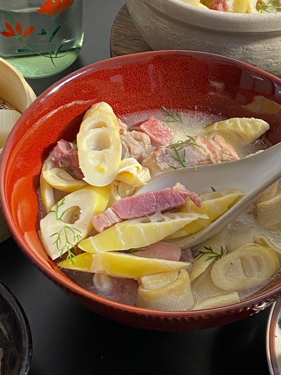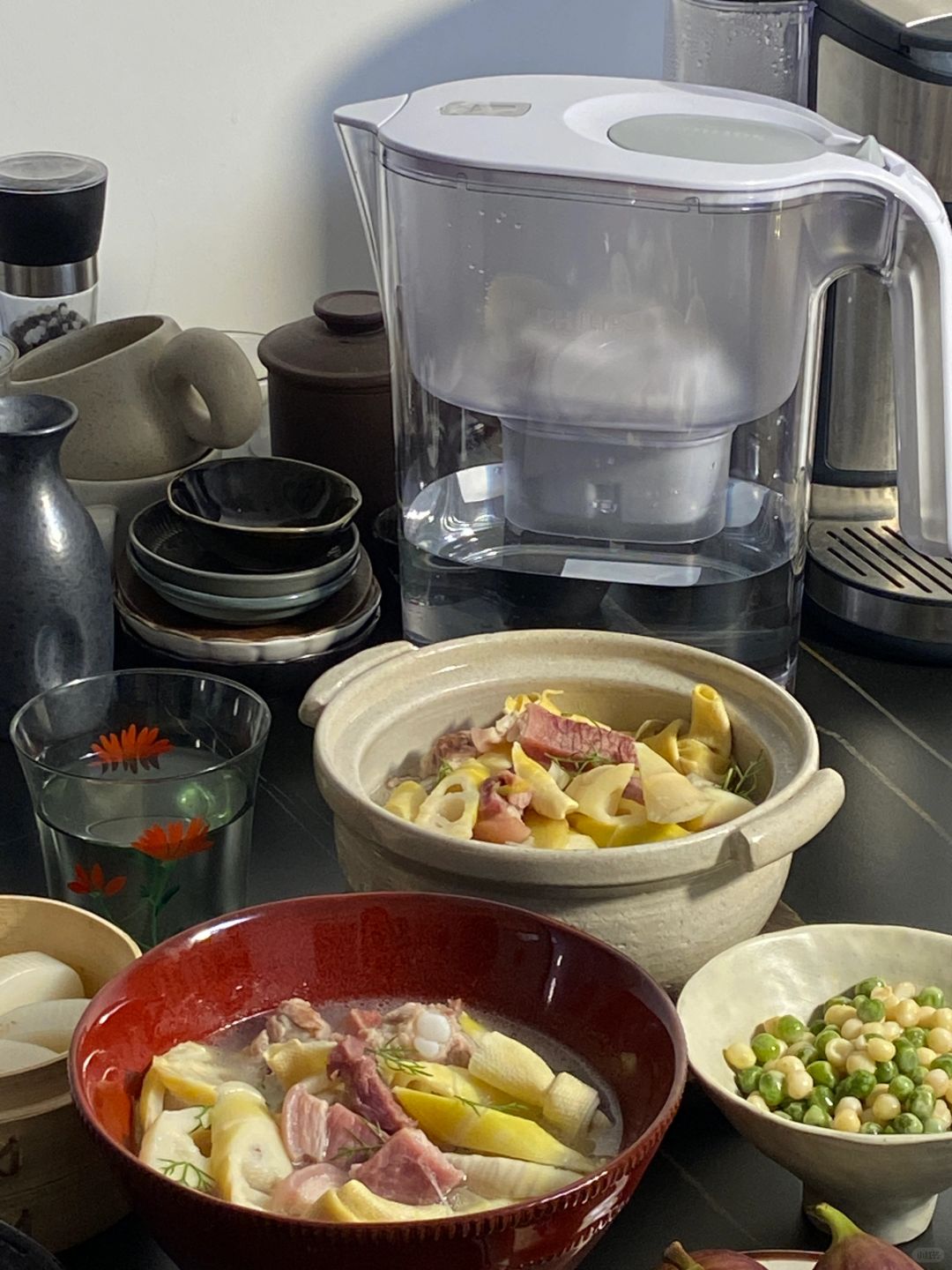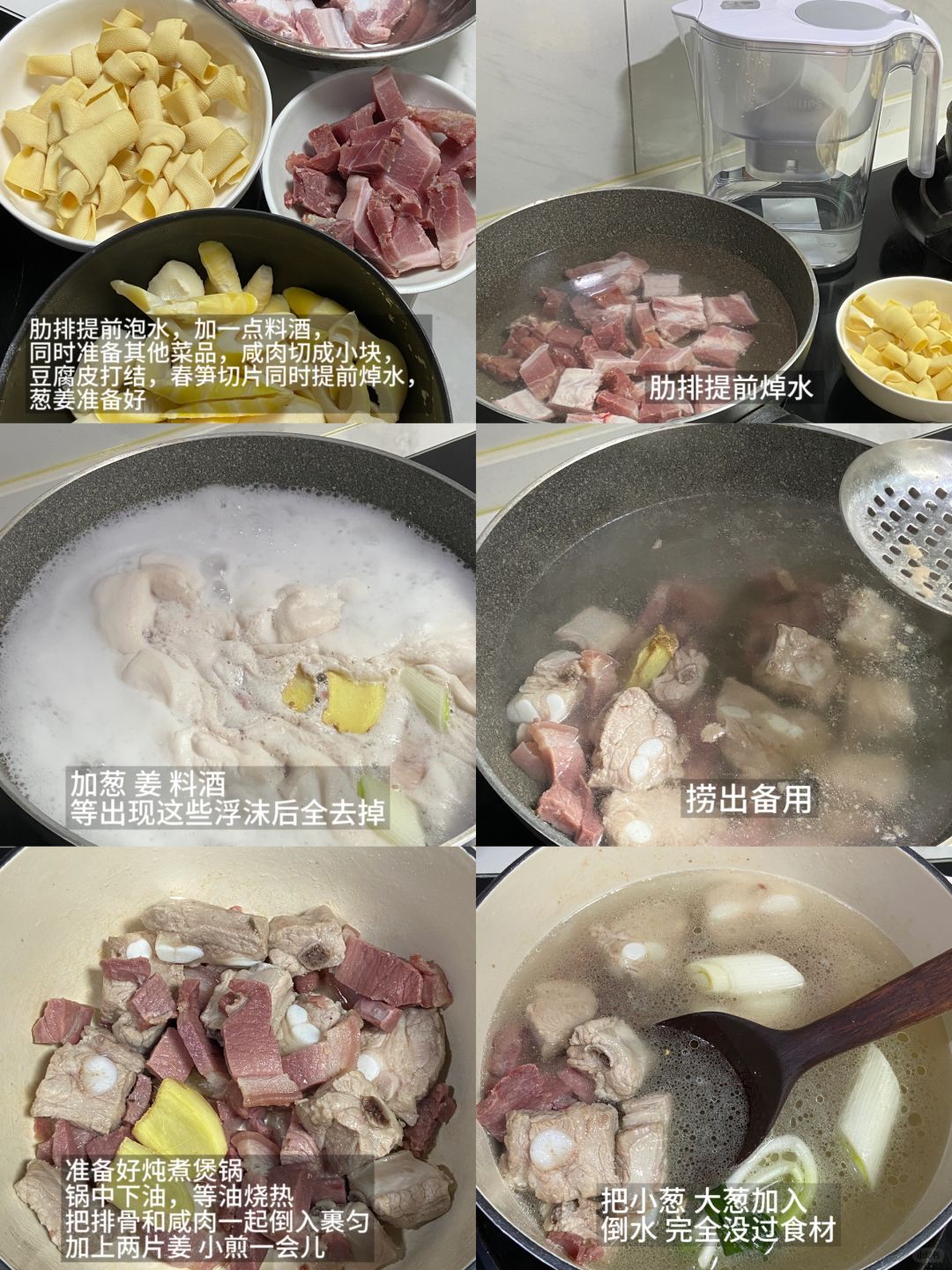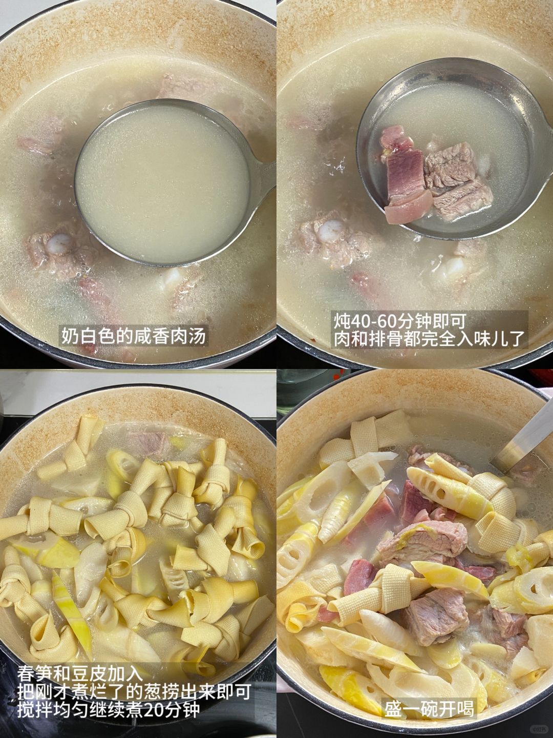 一碗下肚好幸福!咸香、鲜美的味道融合在这一碗里,食材简而味足大概就是这样吧! 食材: 咸肉250g|肋排1条|春笋300g|鲜豆皮|葱|姜 步骤: 1)肋排提前泡水,加一点料酒,同时准备其他菜品,咸肉切成小块,豆腐皮打结,春笋切片同时提前焯水,葱姜准备好 2)准备好菜品后,先把泡完水的肋排和咸肉一起放锅中焯水去浮沫 3)另起锅烧油,直接用煲汤锅,油热后先把排骨和咸肉一起倒入,裹油小煎一会儿 4)煎到差不多倒水,大概倒了1L,盖盖子水开后转小火慢煮 5)防止水煮干,中途开盖再加一次水,大概煮了40多分钟,这时候汤已经是奶白色了,喝一口有咸肉的鲜香 6)加入焯好水的春笋和准备好的豆皮,一起倒入煮大概二十分钟入味儿,基本上最后只加了小半勺盐,味道刚好合适,其他调料完全不用加了 ps时常被家里的水质问题困扰,做饭时候用来焯水,洗菜都是水龙头直接使用,不免会有一些杂质没被过滤,就在京东买的净水壶,过滤后是可以直接喝的。京东五星电器质量🆗的,大家可以看看噢